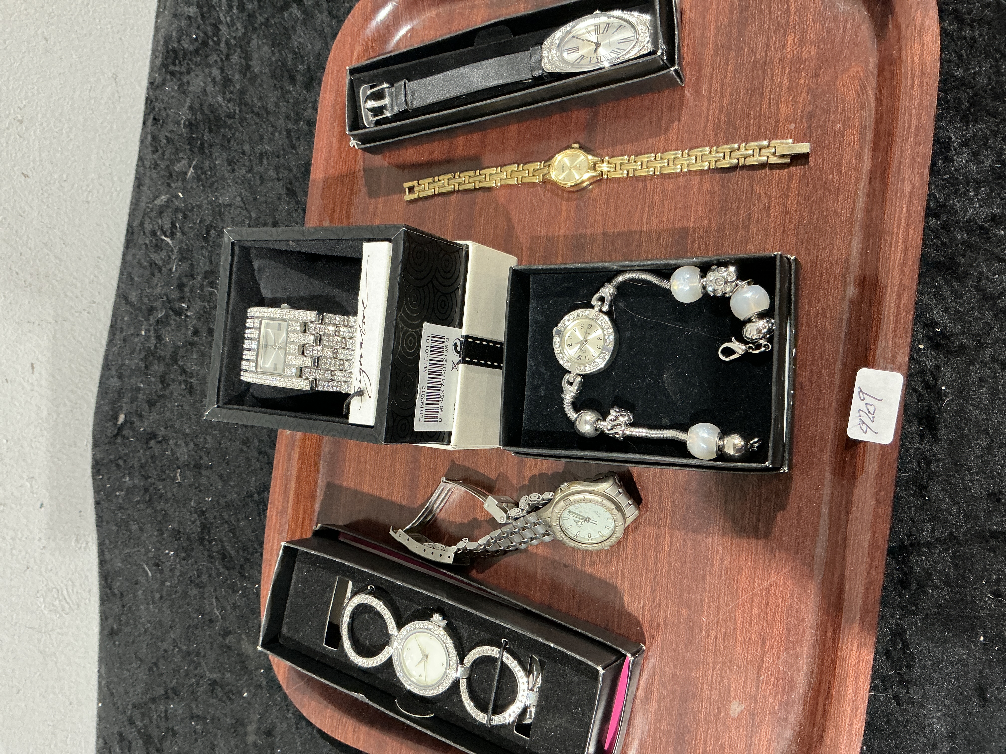 A collection of six ladies’ quartz wristwatches and watch bracelets, primarily constructed from silver-tone and gold-tone base metal with crystal and rhinestone accents. The lot includes four watches presented in original black gift boxes and two loose wristwatches. The styles are consistent with contemporary costume and fashion jewelry. Specific items include a silver-tone link watch with a crystal-encrusted bezel and band elements; a loose silver-tone Sekonda watch; a heavily crystal-set rectangular silver-tone watch contained in a box labeled “Signature”; a silver-tone watch bracelet incorporating white opalescent beads and charm elements; a slim, loose gold-tone link watch marked Sodiea on the dial; and an oval, crystal-bezel silver-tone watch with a black strap. All watch faces are marked “QUARTZ.”