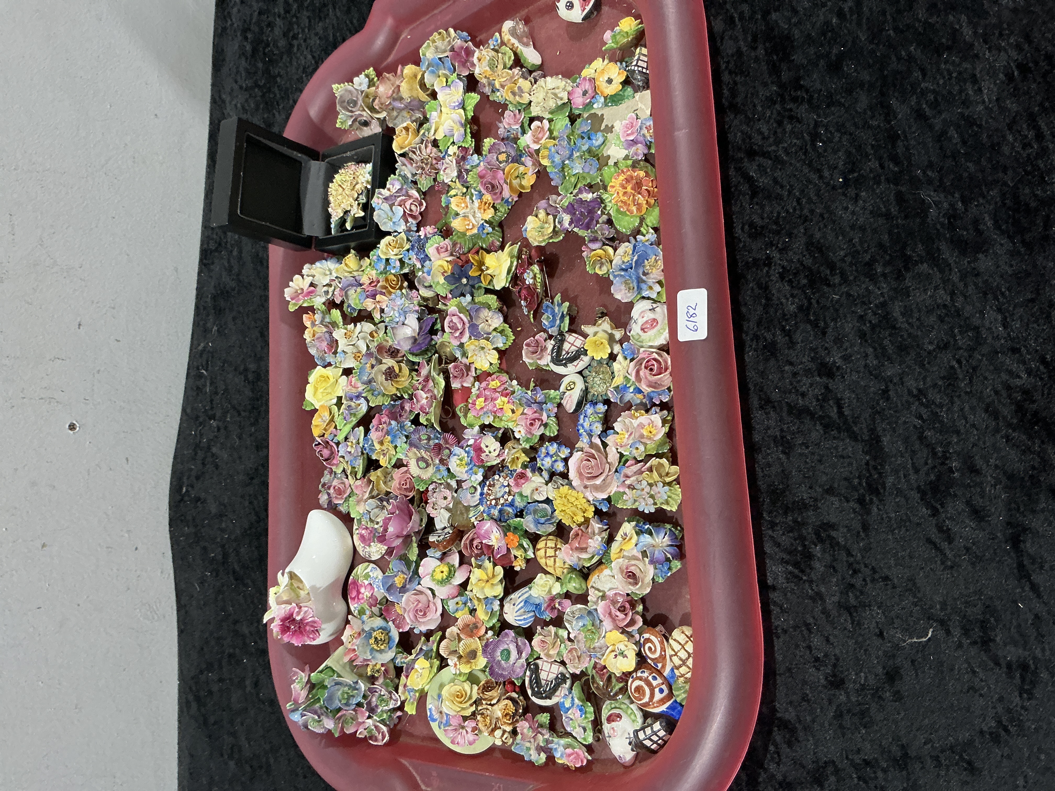 A large collection of 62 individual small decorative items, predominantly composed of hand-painted glazed ceramic or porcelain. The pieces are executed in a polychrome floral style, characteristic of 20th-century cottage ware or Dresden flower applications. The majority of the collection consists of intricate floral sprays featuring various blossoms, including roses, pansies, and forget-me-nots, many of which appear to have fittings on the reverse suggesting their original use as brooches, pins, or decorative embellishments. The collection also includes several distinct figural items, such as a white ceramic clog or slipper holding a pink floral spray, and several small, patterned snail forms. One yellow floral piece is presented inside a small, open, black jewelry box. The items are displayed in a red plastic tray resting on a black textured surface. A small white label marked 6182 is visible near the front edge of the tray.