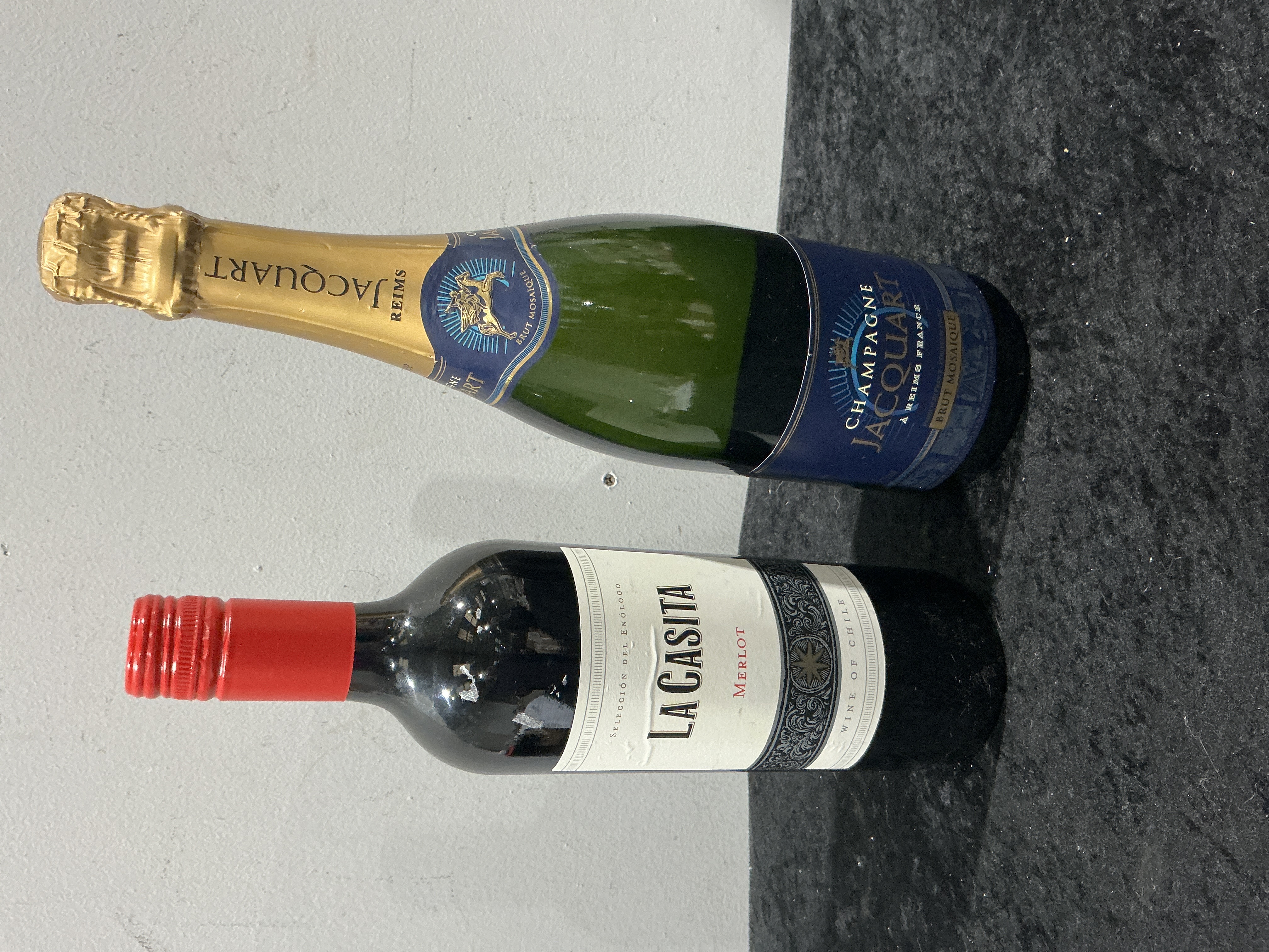 A pair of sealed commercial beverage bottles. The lot includes one bottle of Jacquart Champagne À Reims France Brut Mosaique, presented in a tall green glass bottle with an intact gold foil capsule and a blue and gold label featuring the Pegasus motif. The Champagne is identified by web consensus as the Brut Mosaique Non-Vintage expression. The second item is a dark glass bottle of La Casita Merlot Wine of Chile, labeled “SELECCIÓN DEL ENÓLOGO,” sealed with a red metal screw cap. Both bottles appear to be standard 750ml size, consistent with contemporary commercial production.