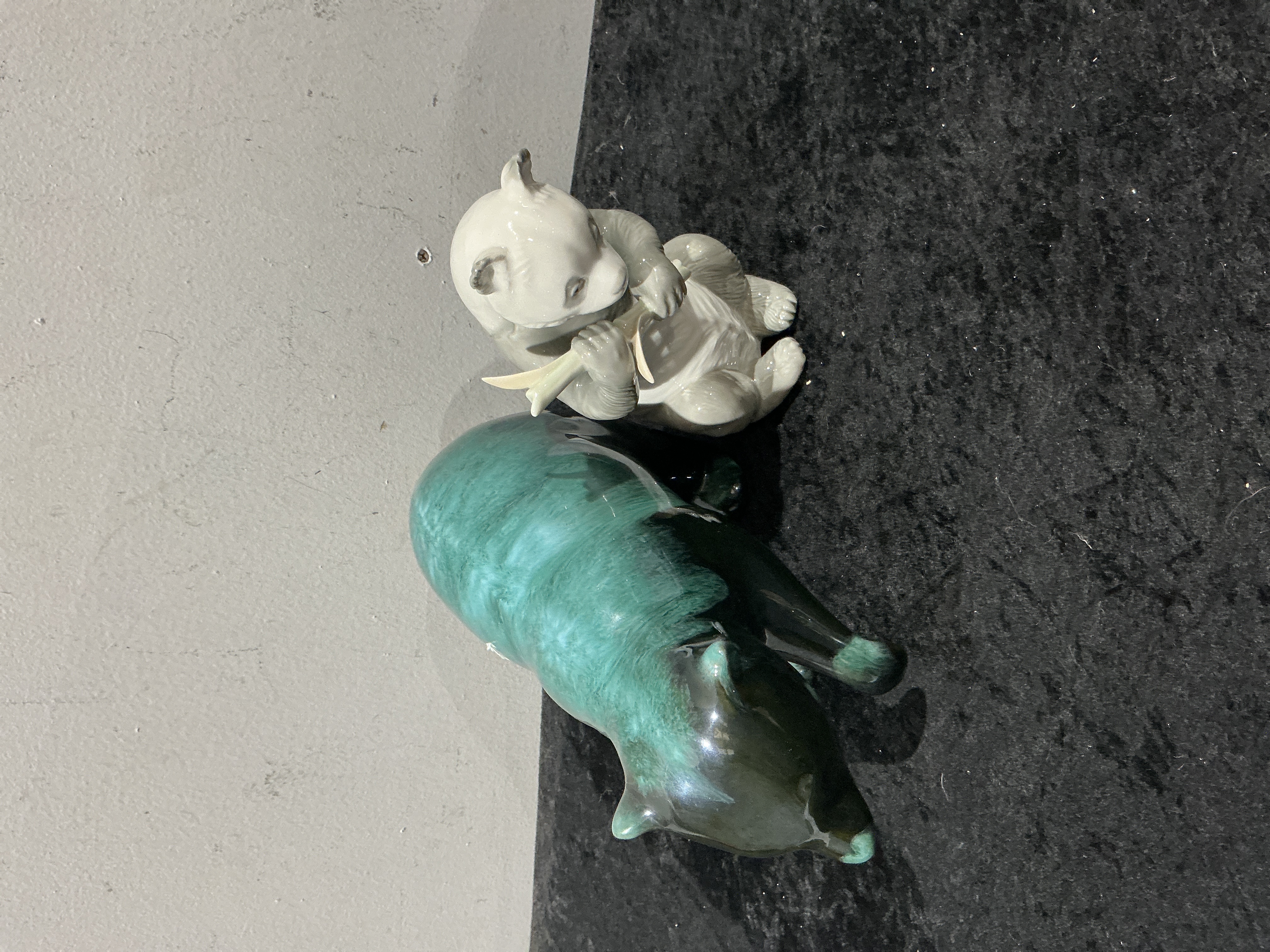 A collection of two distinct ceramic animal figurines. The first item is a large, stylized prone creature, identified through consensus as being consistent with the style of Blue Mountain Pottery (BMP) or similar Art Deco ceramic manufacturers. This figure features a highly glossy, flowing variegated drip glaze ranging from deep turquoise and teal to dark forest green and black. The base openings reveal unglazed terracotta earthenware (redware) construction. The second item is a smaller porcelain figurine depicting a seated panda bear. The panda is rendered primarily in white and grey glaze and is holding a yellowish stalk of bamboo. The base of the panda figure displays impressed and painted markings, which are currently obscured by four affixed green felt pads.