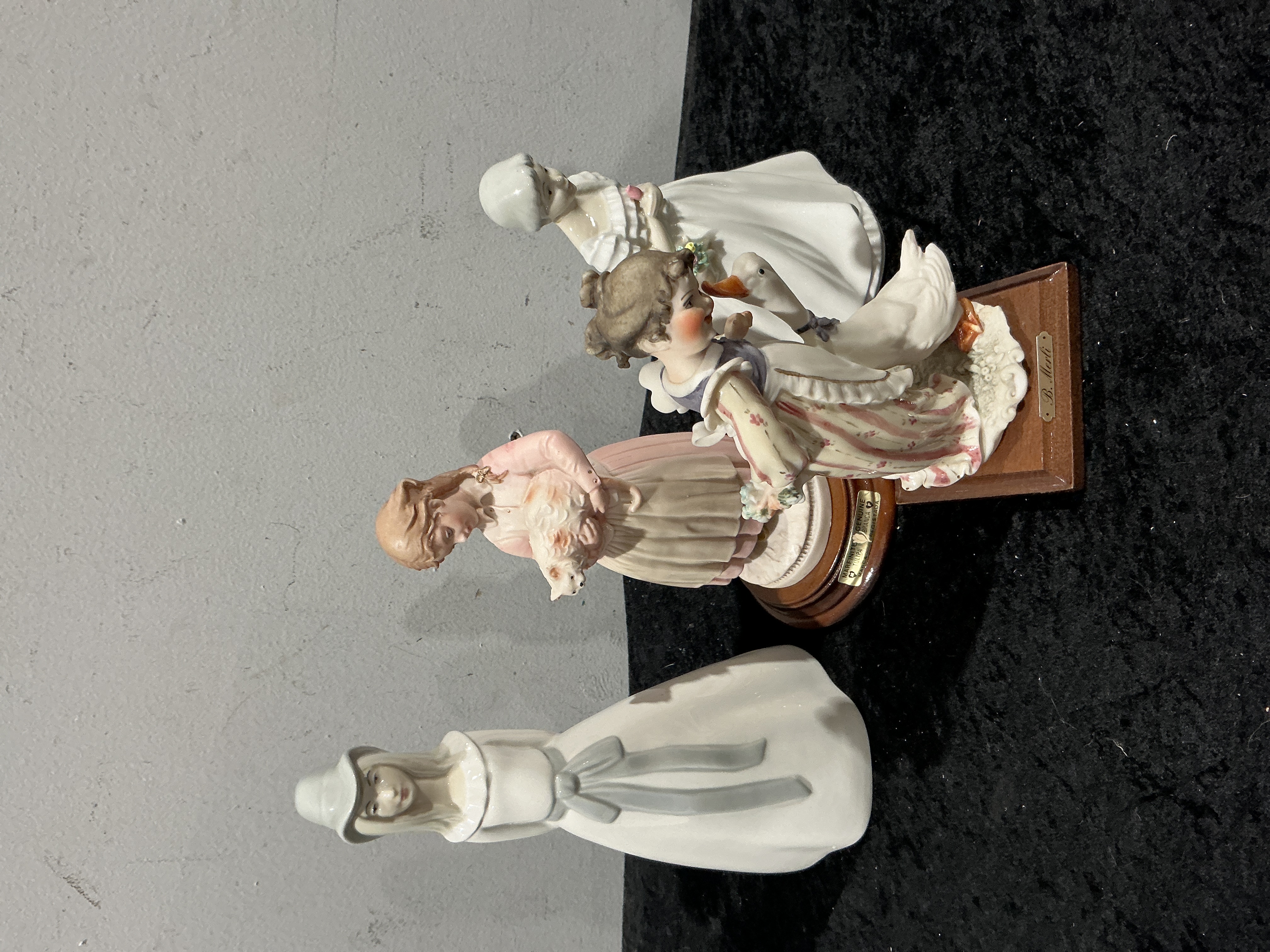 A collection of four glazed and painted porcelain or fine ceramic figural groups stylized to Lladro, depicting young women or girls in pastoral and historical genre styles. The grouping consists of four individual figures. One figure, dressed in pink and holding a piglet, is mounted on a circular wooden base featuring a gold plaque partially marked AMERICAN FAMILY. A second figure, wearing a striped dress and interacting with a goose, is secured to a rectangular wooden base bearing a small plaque inscribed B. Hart. The two primarily white figures show visible impressed and stamped circular maker’s marks on their undersides, including a green printed mark on one figure. The style and material align with Lladro’s production of figural groups such as the “Three Sisters” series.