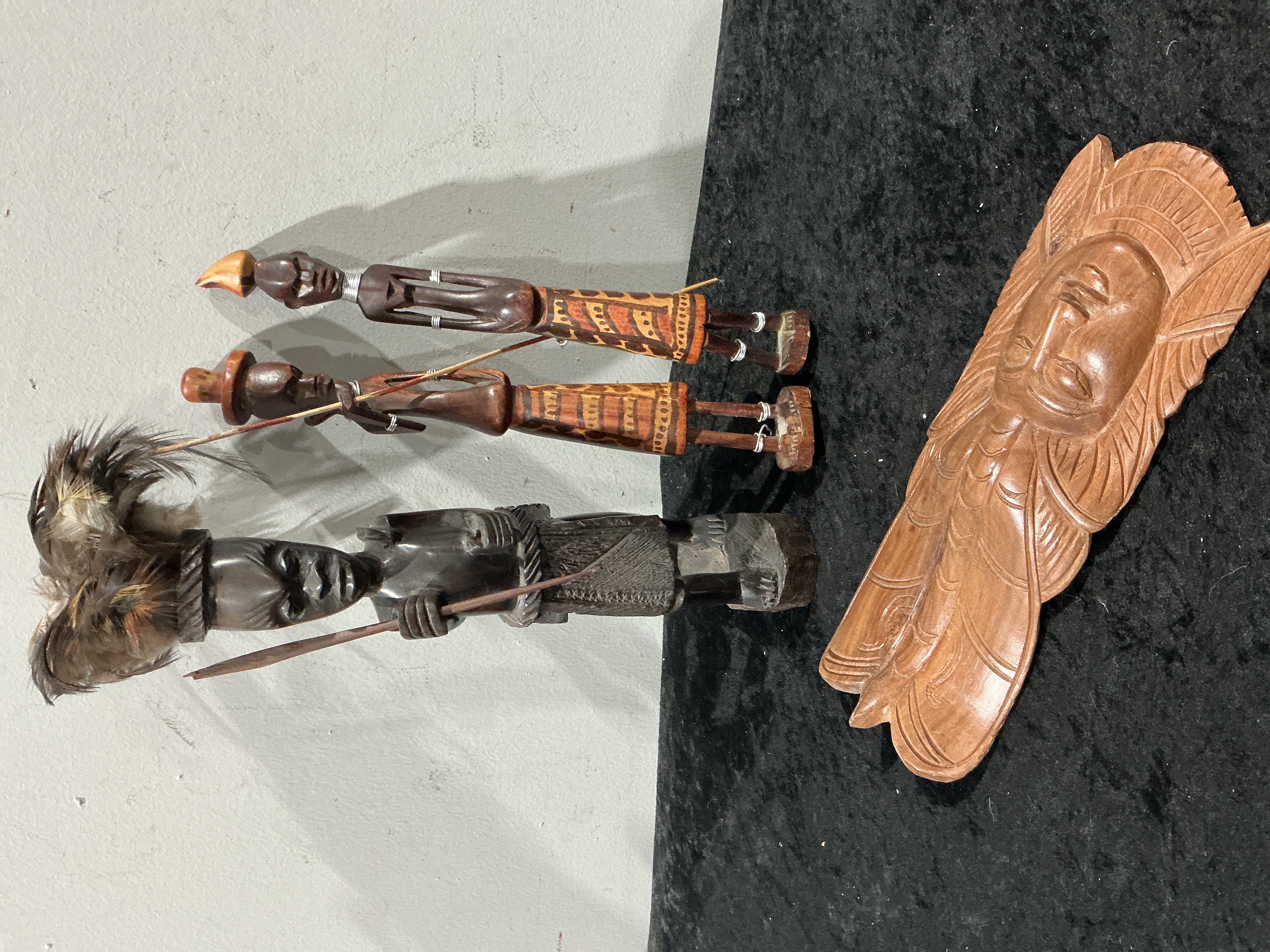 A collection of four hand-carved wooden objects, comprising three figurative sculptures and one relief panel/mask, executed in styles consistent with global tribal or tourist art. The collection includes three standing figures and one flat relief carving. The largest standing figure is executed in dark-stained wood, depicting a male figure holding a wooden spear, and is adorned with a brown feather headdress. The two smaller standing figures are carved from medium-toned wood, featuring slender forms. They are decorated with hand-painted patterned skirts in orange and black tones and accented with silver-colored wire rings at the neck and ankles. One small figure wears a carved hat, and the other a pointed headpiece. Both hold staffs or spears. The fourth item is a reddish-brown wood relief carving depicting a stylized human face surrounded by radiating, wing-like carved elements, consistent with spirit board or mask forms.