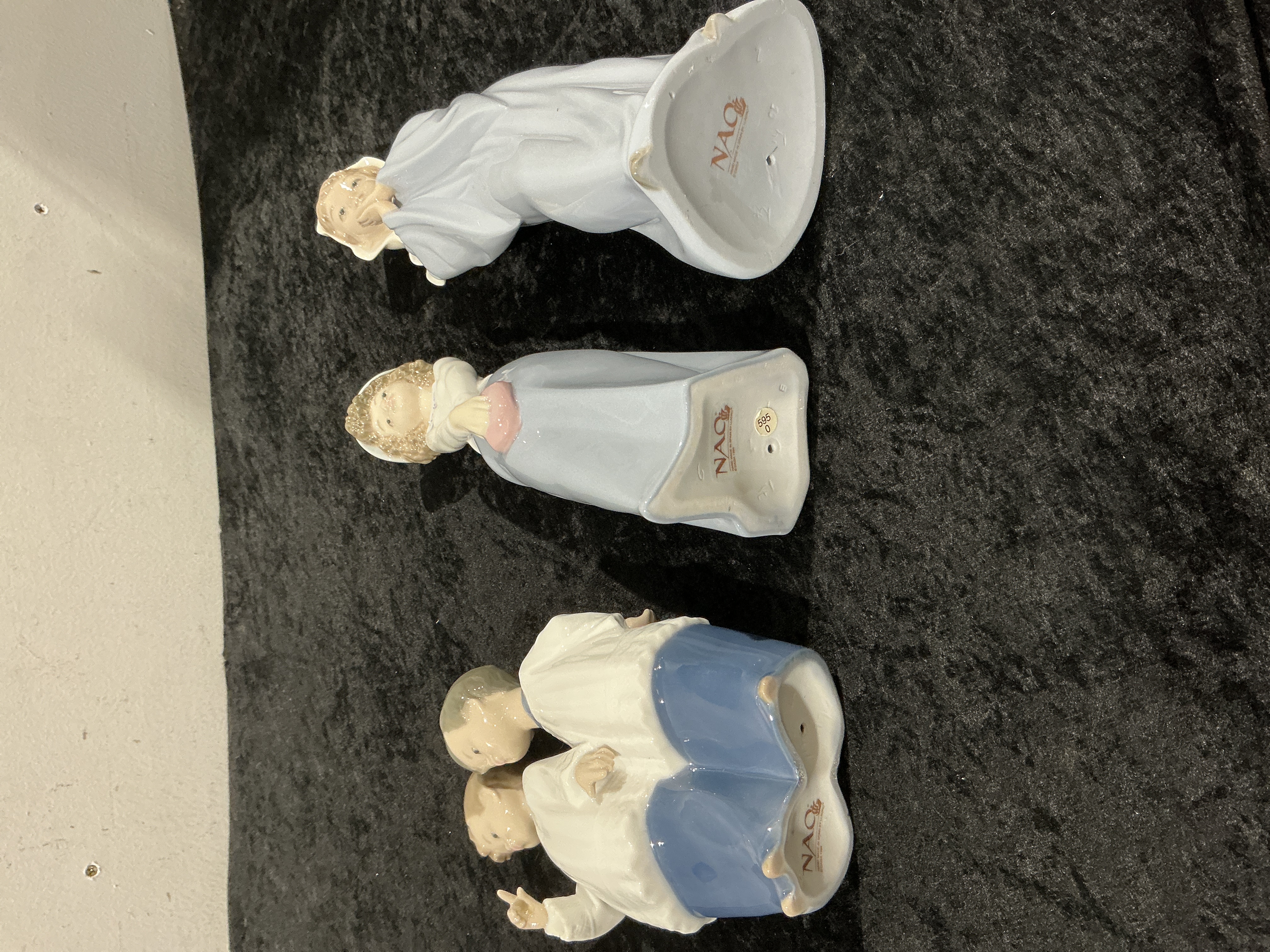 A collection of four glazed porcelain figurines manufactured by NAO, a division of Lladró. The pieces feature a characteristic soft pastel palette, predominantly utilizing light blue and white glazes. The collection includes four unique subjects: a grouping of two boys standing together, a standing woman in a white blouse and blue skirt holding a pink clutch, a taller woman wearing a white veil and blue robe with hands clasped in a praying or devotional posture, and a woman in a flowing blue garment looking upwards. Each base bears the visible red printed mark “NAO Made in Spain.” The figurine of the standing woman holding the pink clutch bears a separate price sticker marked “9245.”