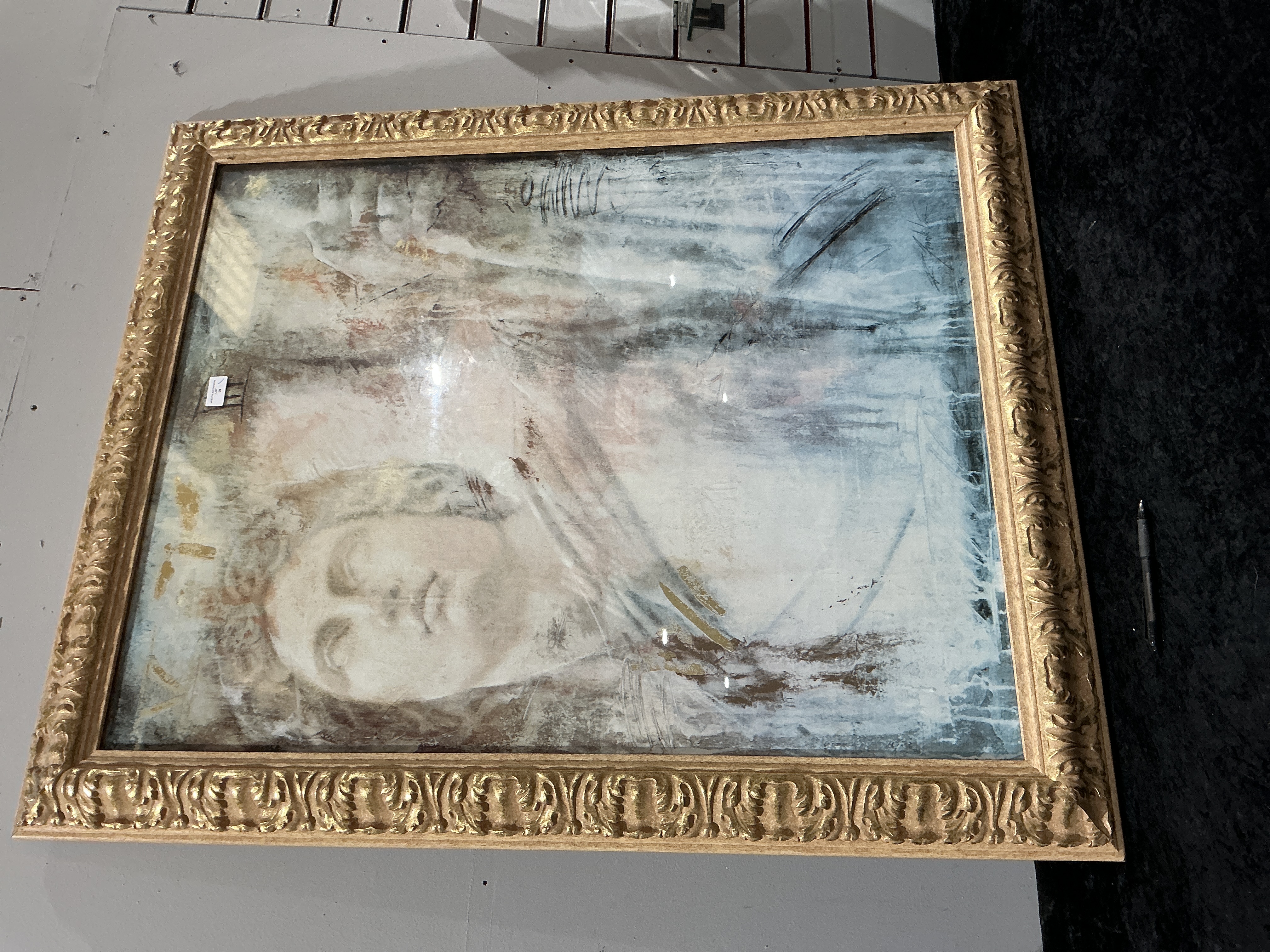 A large framed artwork identified through market consensus as ‘Achelous’ by Richard Franklin. This piece is a mixed media print or giclée on canvas or board, featuring an abstracted representation of a classical male bust or statue, likely Achelous, the Greek river god. The composition utilizes distressed and dripped paint effects in a muted palette of white, blue, brown, and gold highlights, giving the work an intentional aged patina. The artwork is presented in a substantial, deep, gold-toned frame featuring ornate, high-relief foliate and scroll motifs consistent with a Baroque or Rococo revival style. A small auction sticker bearing the text “FINE ART AUCTIONEERS” and “LOT 10” is affixed to the surface in the upper right quadrant.
