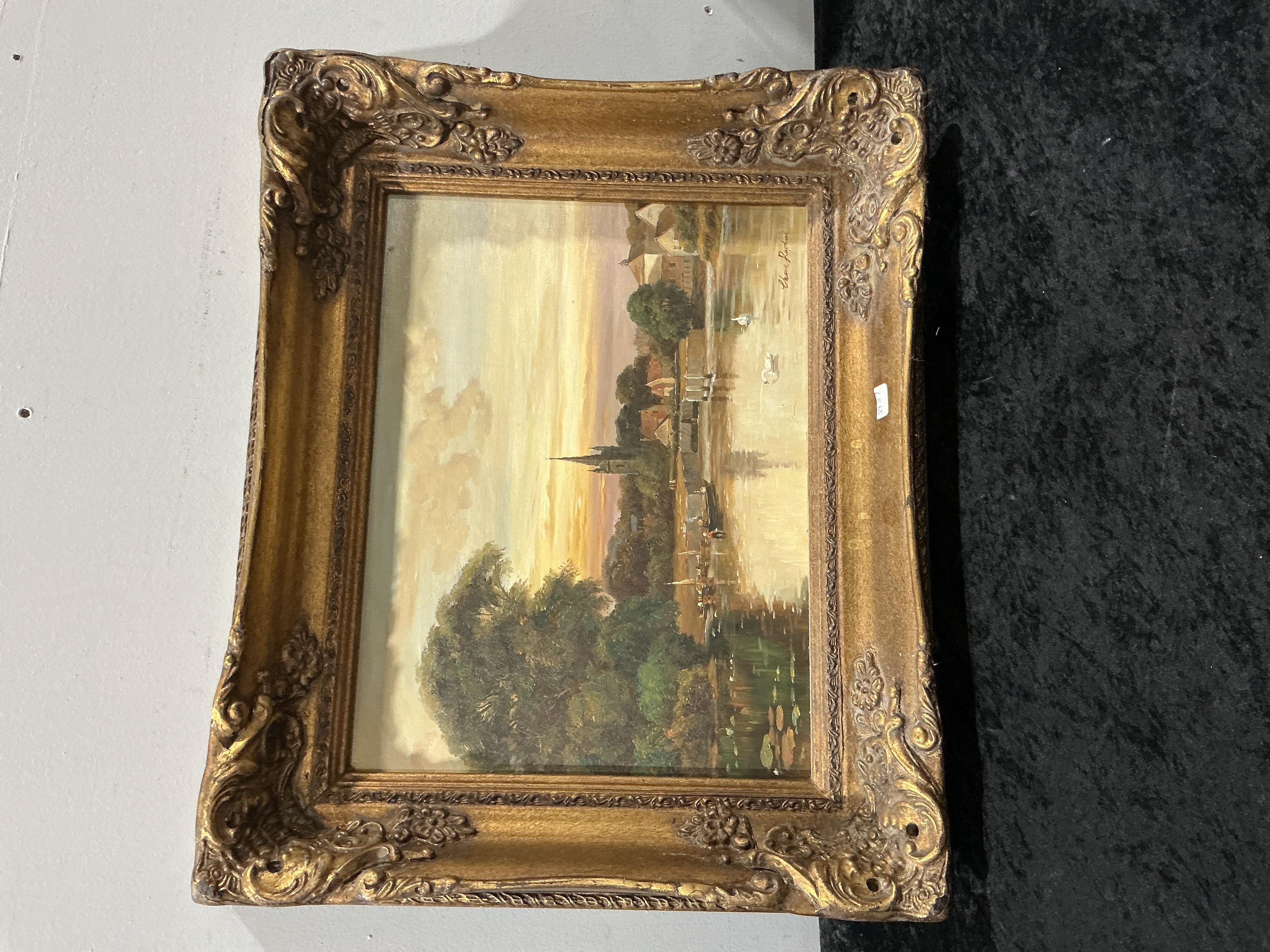 Signed Elvira Raphael Romantic Waterscape Oil Painting in Ornate Gilt Frame