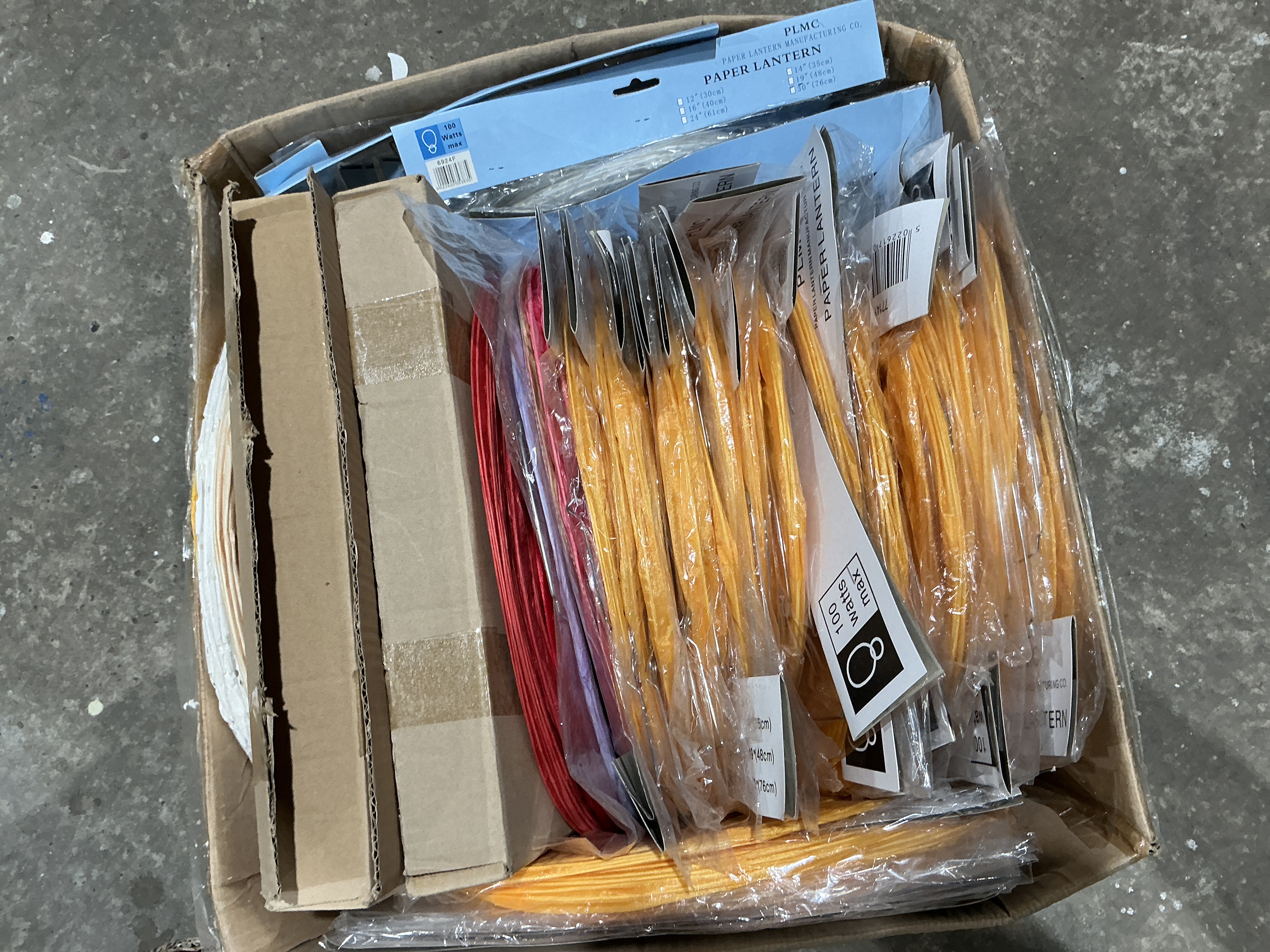 A large collection of 80 mixed material and paper lantern shades manufactured by PLMC Paper Lantern Manufacturing Co. The lot consists of new old stock, collapsible paper lantern shades stored within their original utilitarian brown cardboard shipping box. The collection includes various colors such as orange/yellow, red, purple, pink, and white/cream. Items are packaged both in loose bundles and in distinct retail packaging, sealed in clear plastic with card headers. Visible packaging identifies the manufacturer as PLMC PAPER LANTERN MANUFACTURING CO. and includes technical warnings specifying a maximum wattage of 100 watts max. The retail packaging also lists various potential diameters in inches and centimeters (e.g., 12″ (30cm), 14″ (35cm), 16″ (40cm), 19″ (48cm), 24″ (61cm), 30″ (76cm)). The mixed material construction refers to the paper shade material and the internal wire or metal support structures used for expansion.