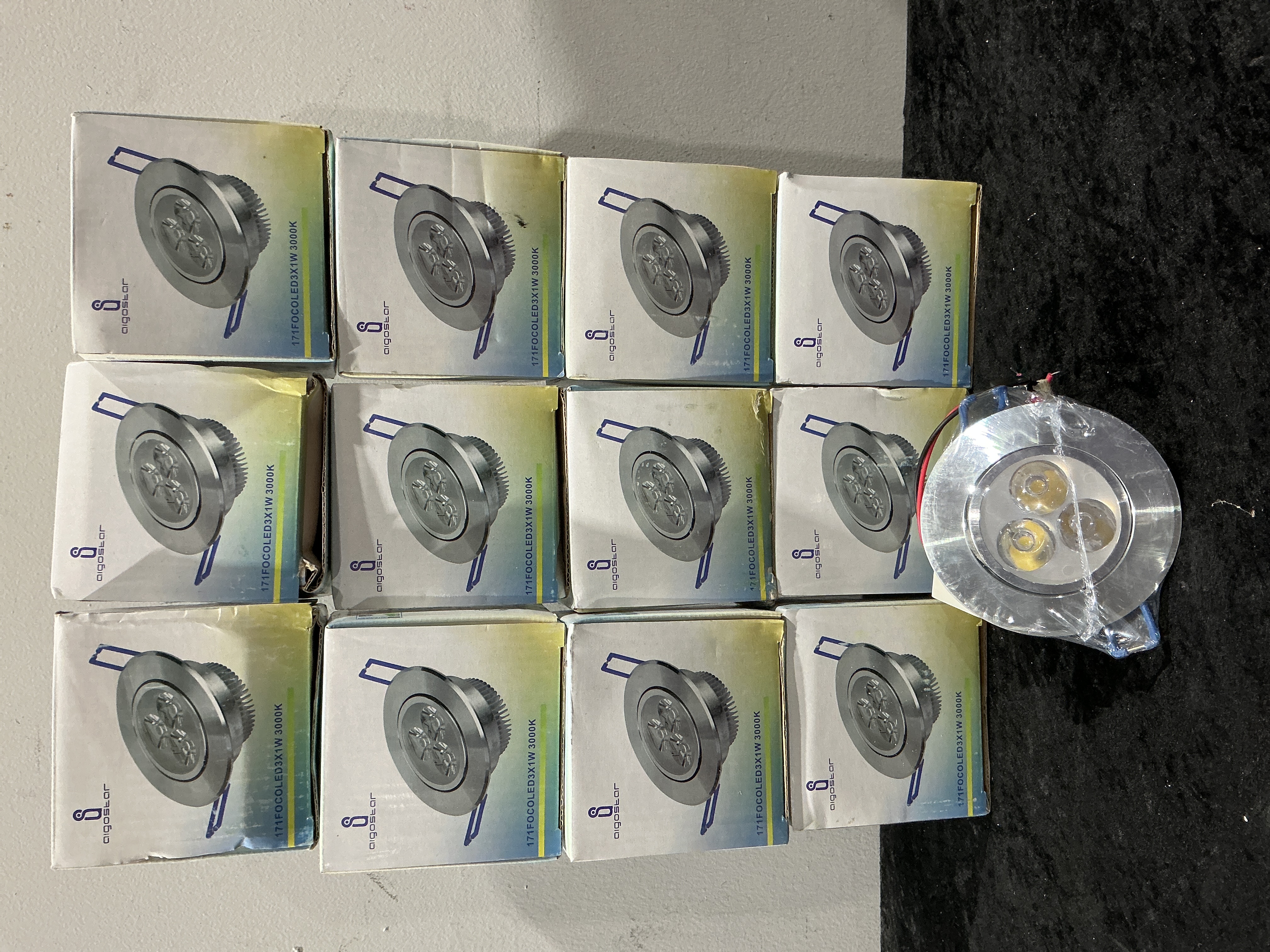 This collection consists of twelve (12) modern recessed LED downlights manufactured by Aigostar. The fixtures are identified by the model number 171FOCOLED3X1W 3000K, indicating a 3-watt output and a warm white color temperature of 3000 Kelvin. The lights feature a circular design with a silver-toned metal housing, likely aluminum alloy, and are equipped with three visible LED components. The lot is composed of eleven identical units retained in their original branded cardboard packaging, stacked, and one loose unit wrapped in clear plastic, resting in the foreground. The loose unit displays its connecting wires. These fixtures are designed for ceiling or cabinet installation as spotlights or downlights.