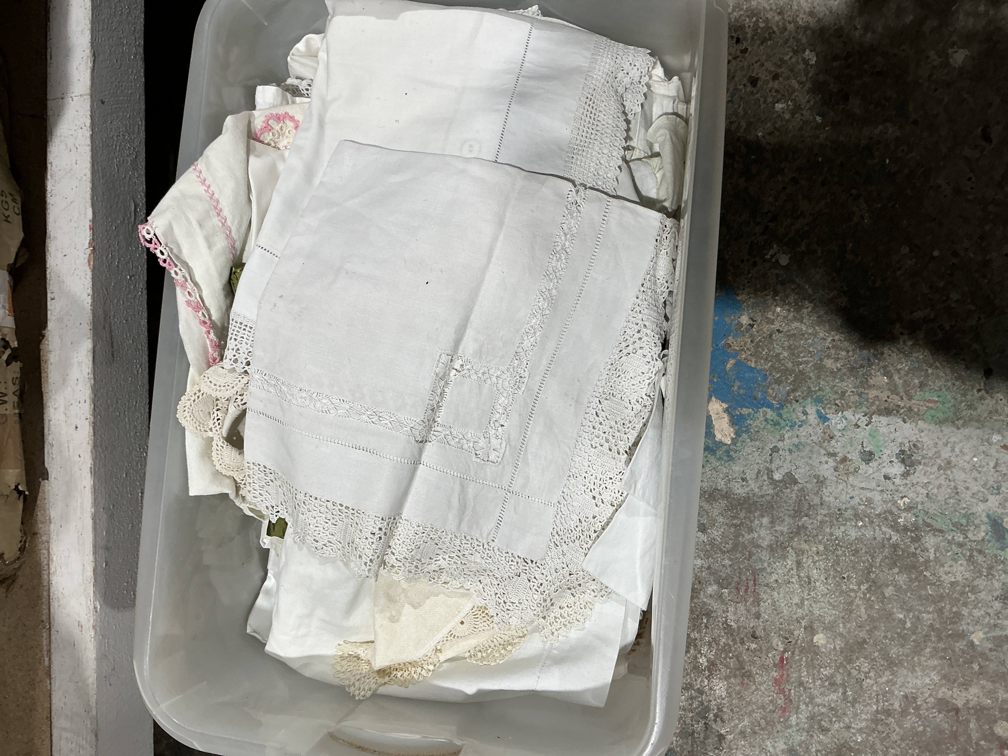 An assortment of vintage household textiles primarily constructed from white cotton and linen fabrics. The collection includes various items such as tablecloths, napkins, and doilies. Decorative techniques observed include wide lace borders, intricate crochet work, filet crochet, hemstitching, and cutwork. One specific piece features pink embroidered scalloped edges. The textiles are primarily white in color and demonstrate various hand-worked and machine-finished details common to mid-20th-century household linens.