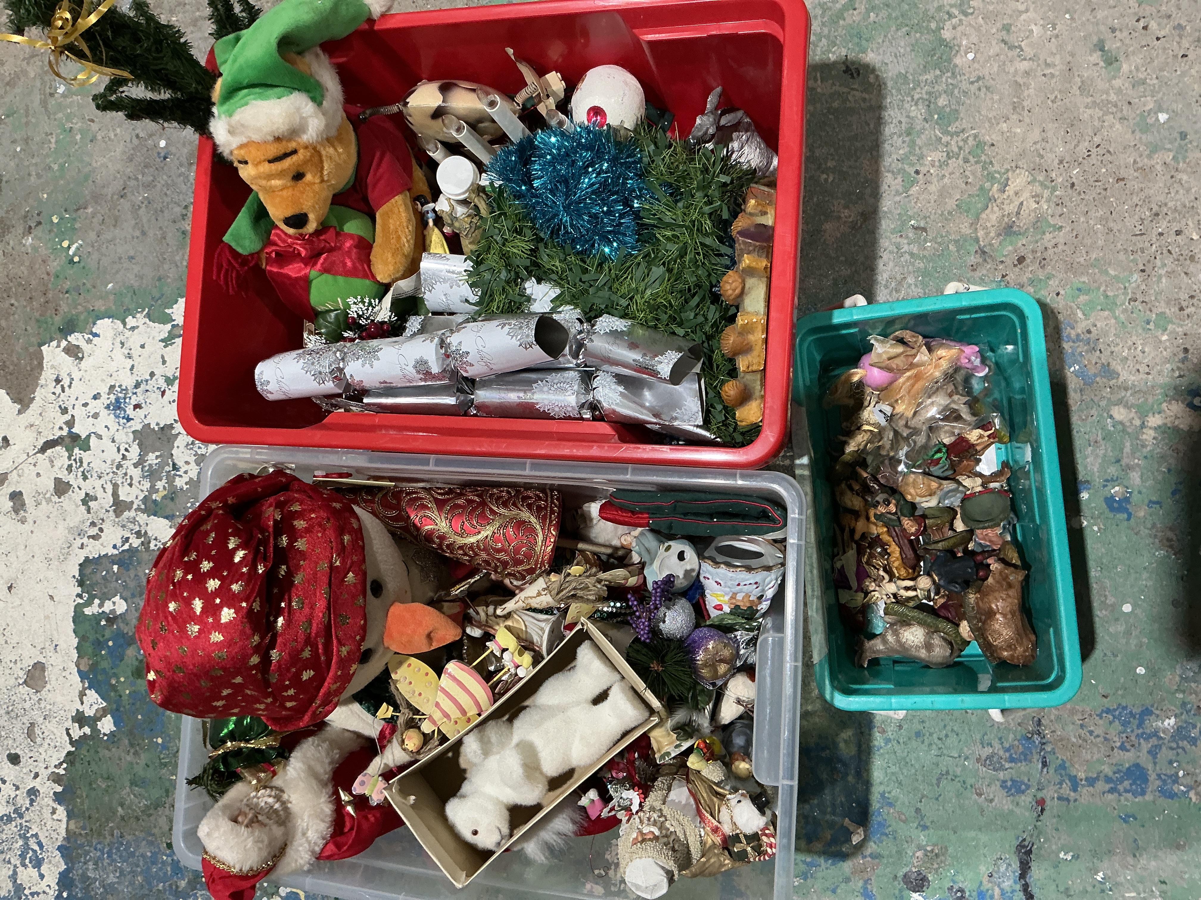 An assortment of holiday-themed items and Christmas decorations contained within three plastic storage bins. The collection includes plush figures, notably a character resembling Winnie the Pooh in holiday attire and a large snowman. Also present are several silver-toned holiday crackers printed with Merry Christmas, artificial greenery, tinsel, and various small ornaments and figurines. Materials include synthetic fabrics, plastic, metallic foil, and molded resin. The items are stored loose within one red, one clear, and one green plastic container.