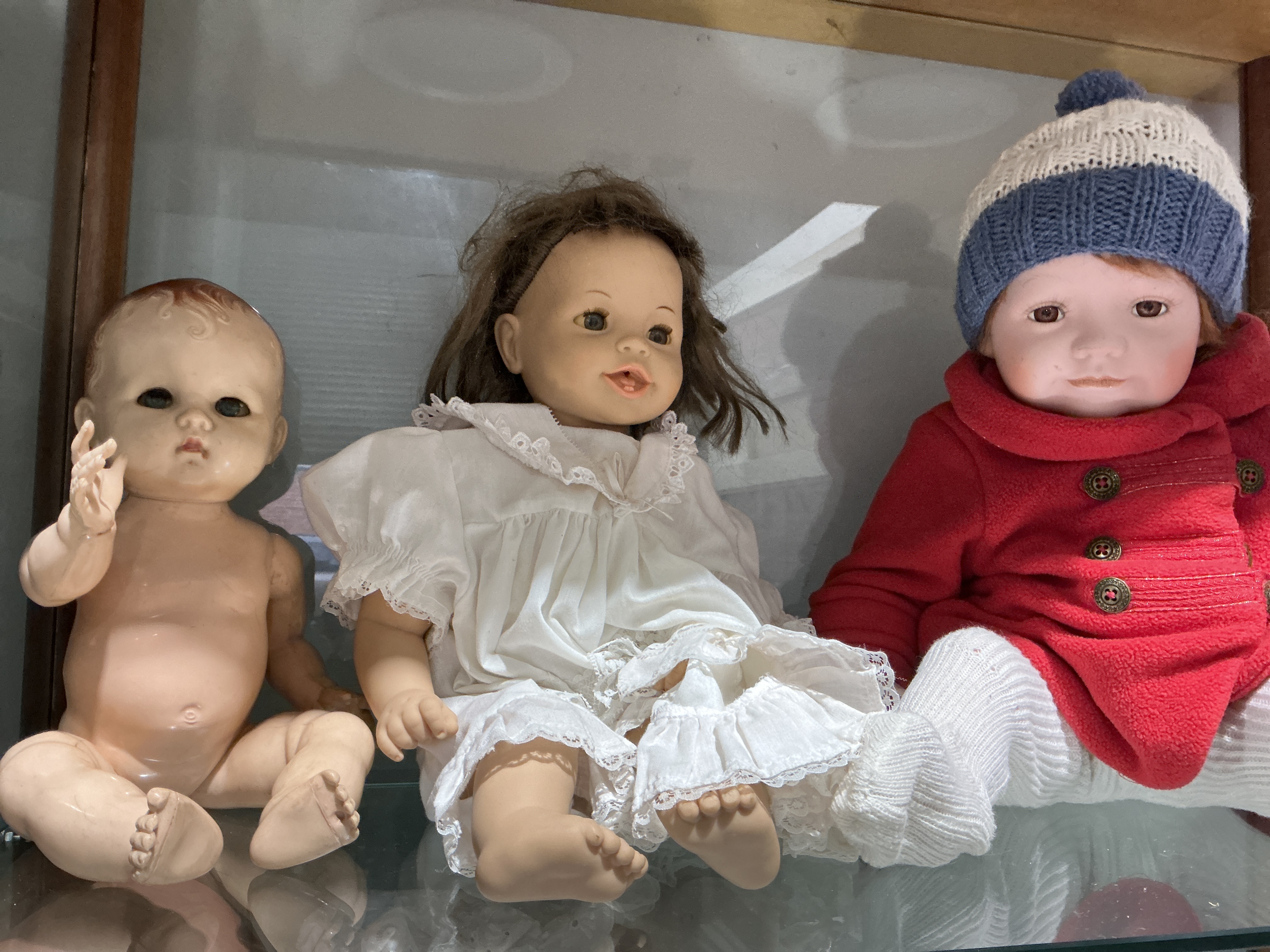 A trio of dolls featuring various designs from the mid-to-late 20th century. The group includes an unclothed infant doll with molded hair, a young girl doll with rooted brown hair dressed in a white lace-trimmed gown, and a doll wearing a red double-breasted coat with a blue and white knit hat and white leggings. Construction materials include vinyl, plastic, and various fabrics. The dolls exhibit features consistent with mid-century and later manufacturing, including rooted hair and molded details. No manufacturer marks are visible on the exposed surfaces.