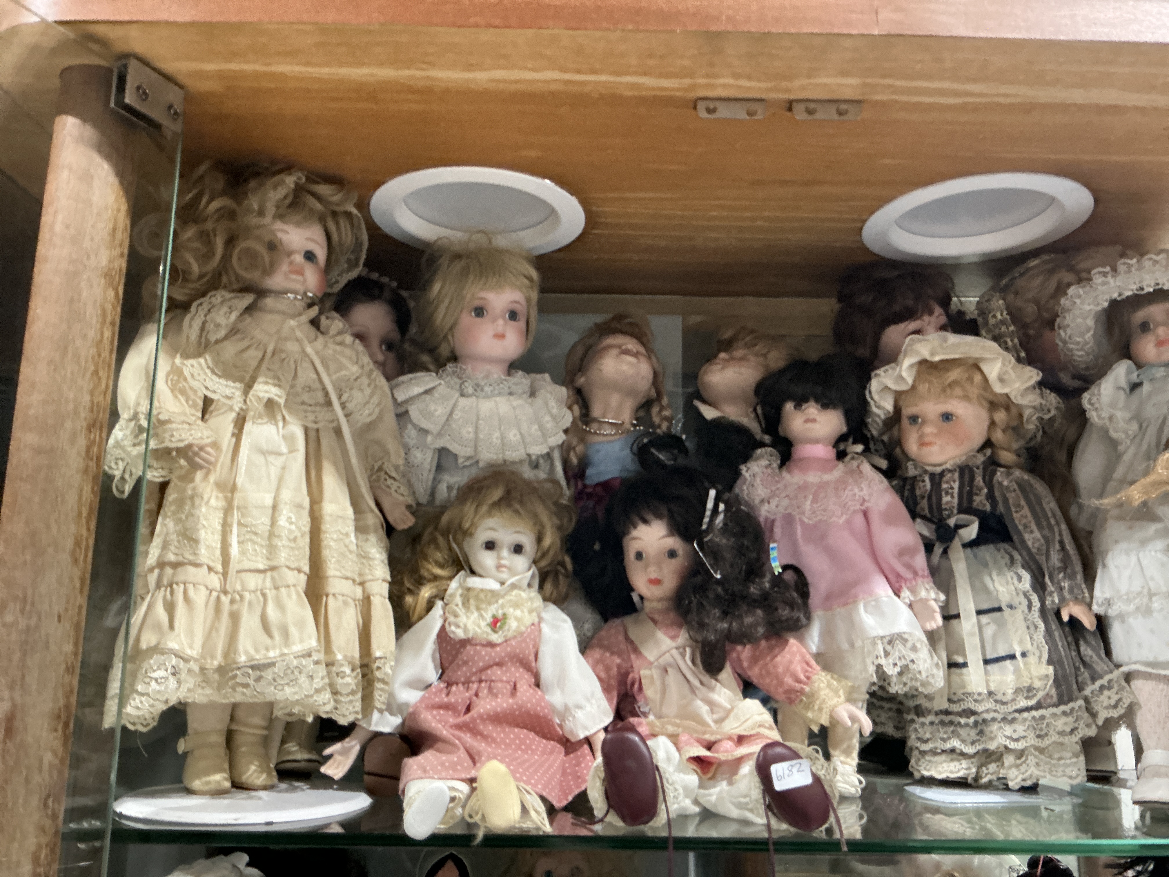 A collection of vintage-style porcelain collector dolls featuring bisque-finished heads, hands, and feet. The dolls are designed with painted facial features and varied synthetic hairstyles in blonde, brown, and black tones. Each figure is dressed in ornate, late-20th-century period-inspired attire, including Victorian-style dresses with lace, ruffles, and tiered fabrics in a palette of cream, pink, and blue. One doll in the foreground bears a small white sticker on its foot marked with the handwritten number 6182. The dolls are presented in various standing and seated poses.