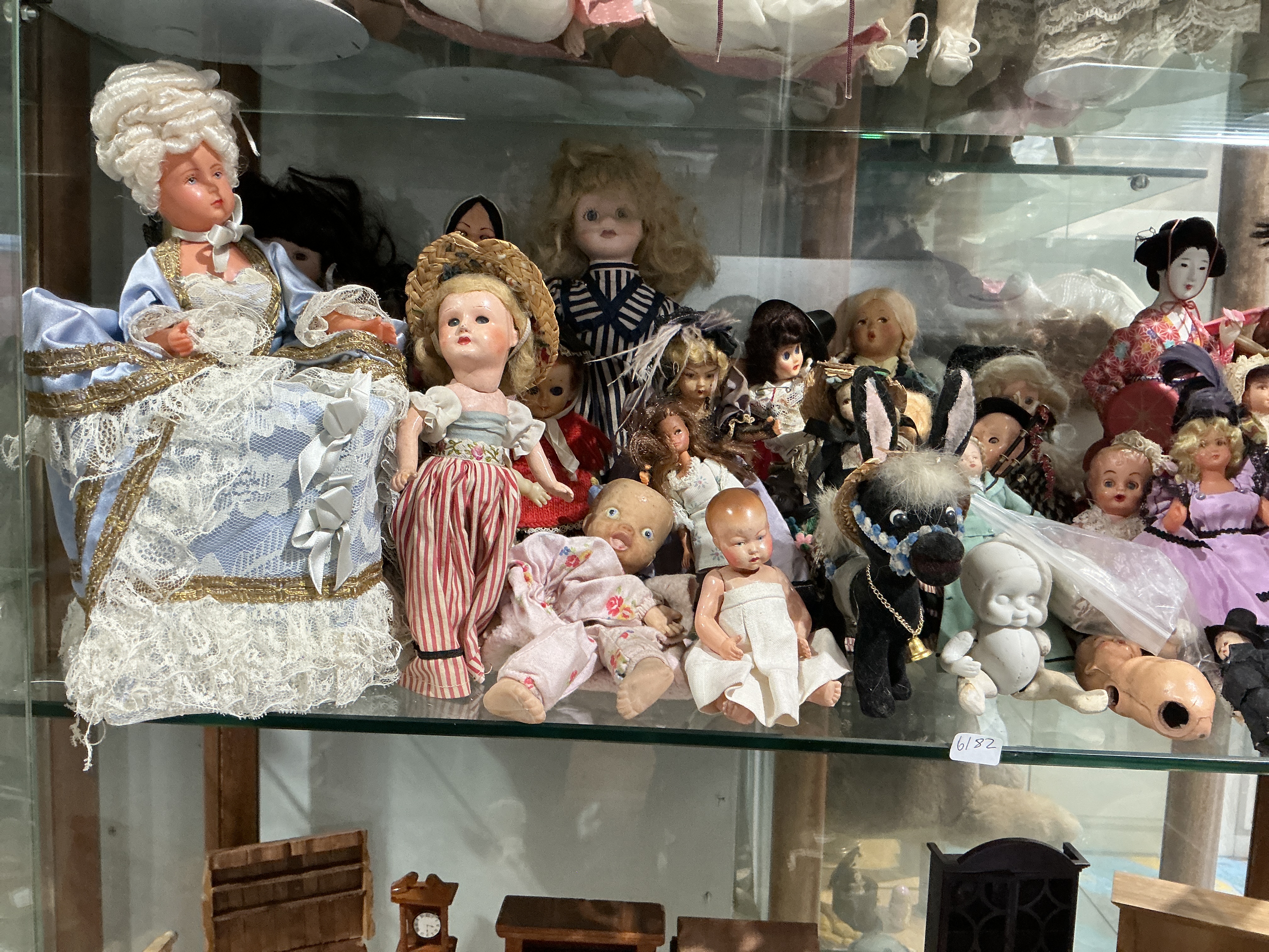 This lot consists of an assortment of dolls of varying styles and periods. Included is a large figure in 18th-century style attire with a powdered wig and lace-trimmed blue gown. The collection also features several mid-20th-century baby and fashion dolls, a traditional Japanese doll in a kimono, and a small black felt donkey with a bell accessory. Construction materials include bisque, porcelain, vinyl, plastic, and various textiles. A small white label with the handwritten number 6182 is visible on the shelf.