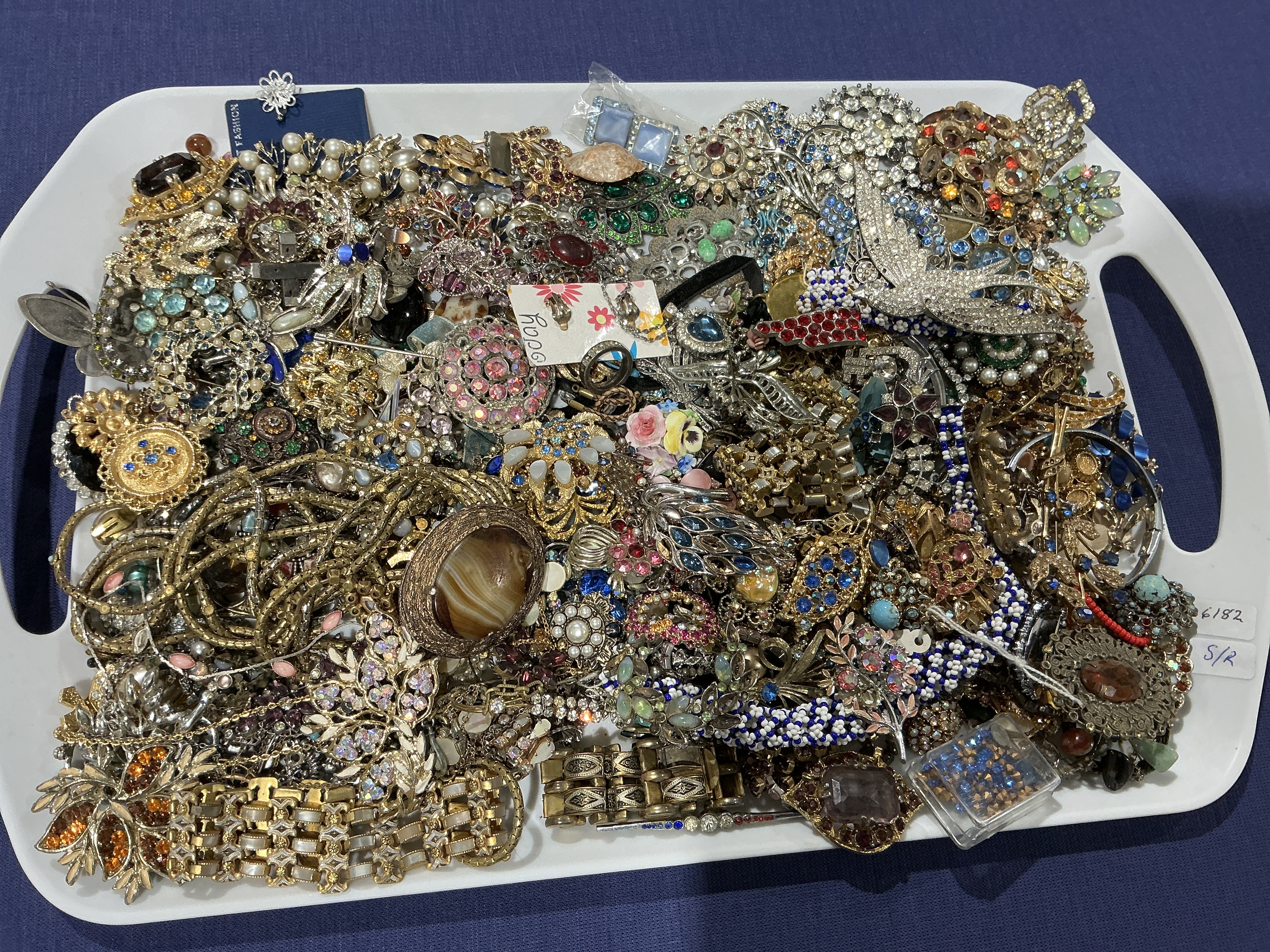 A collection of assorted costume jewelry presented on a white plastic tray. The assembly includes a variety of brooches, bracelets, beaded necklaces, and earrings. The pieces are primarily constructed from gold-tone and silver-tone metals, featuring embellishments such as multifaceted rhinestones in various colors, faux pearls, enamel, and polished stone cabochons including agate. Decorative motifs range from mid-century floral and animal designs, including a large bird-shaped brooch, to abstract and geometric forms. This tray of spares or repair costume jewelry includes some items with handwritten or printed tags. The tray handle is marked with inventory numbers 6182 and S/R.