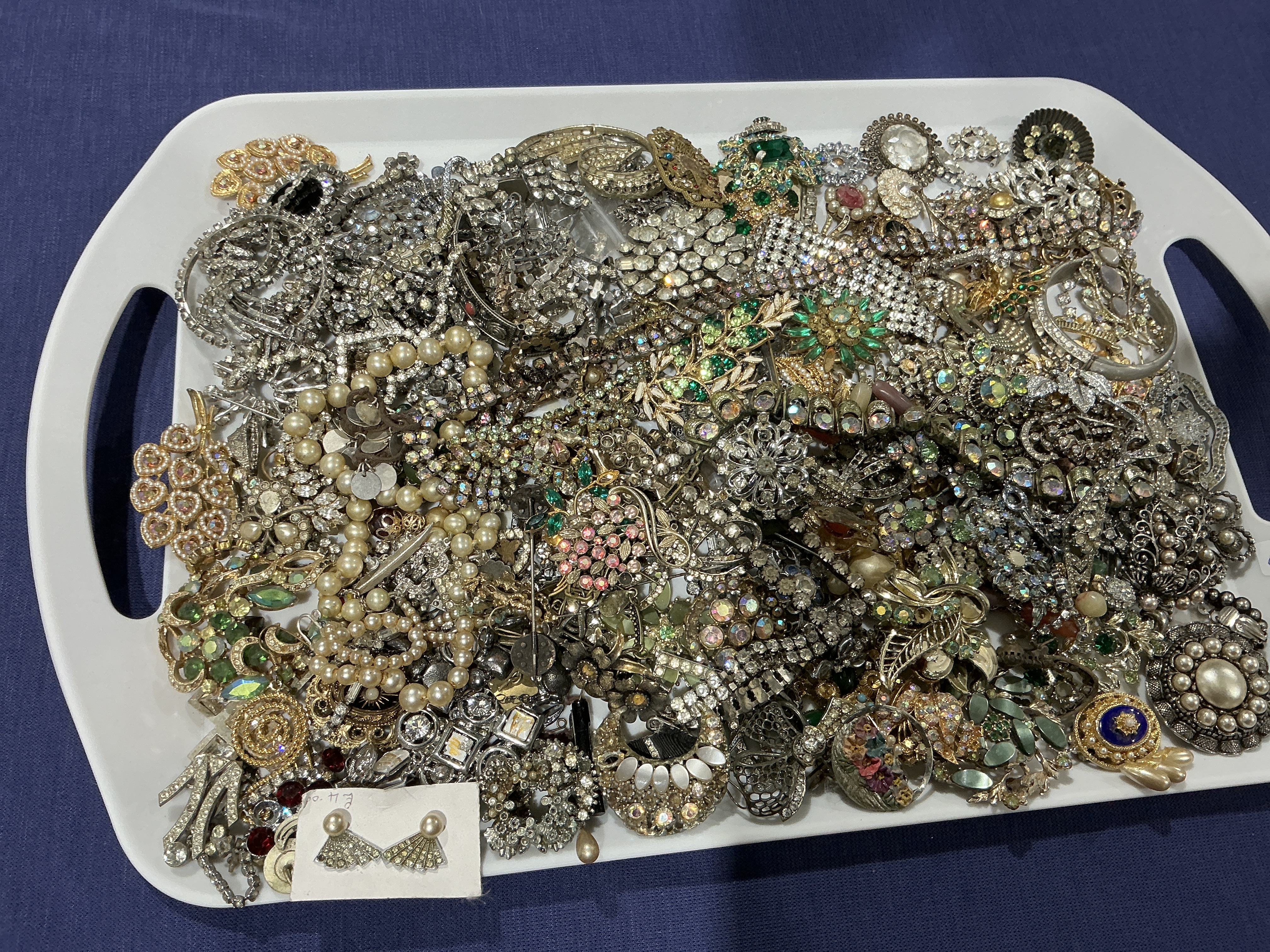 This collection consists of an assortment of mid-to-late 20th-century costume jewelry presented on a white plastic tray with integrated handles. The lot includes various accessories such as brooches, earrings, and pins constructed from silver-tone and gold-tone base metals. Decorative elements feature clear and multi-colored rhinestones, imitation pearls, glass beads, and enamel work. Designs incorporate floral, starburst, and geometric motifs. Notable items include a pair of fan-shaped rhinestone and pearl earrings attached to a card with handwritten markings. The grouping is offered as a tray of spares or repairs.