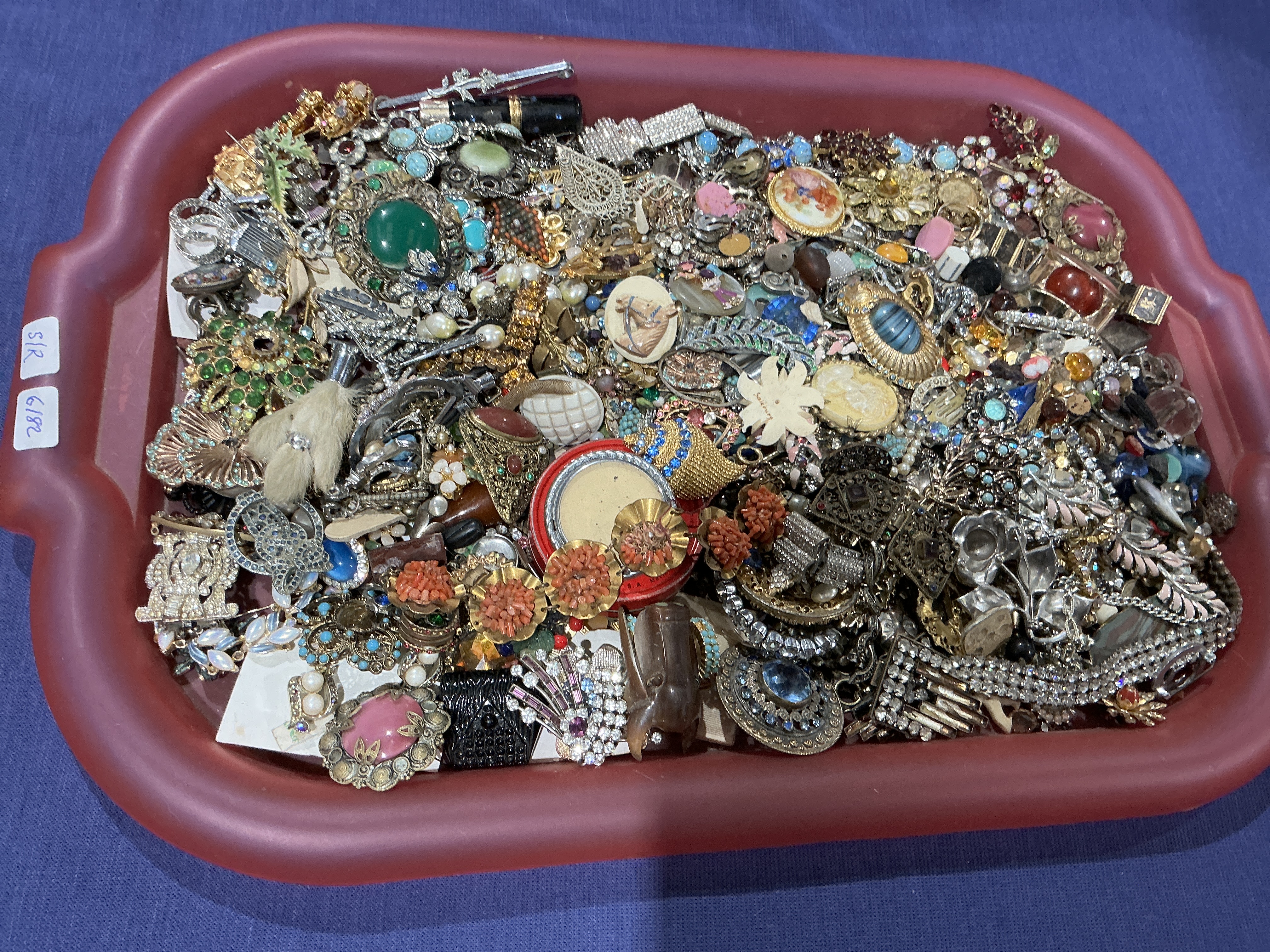 An assortment of vintage and mid-century costume jewelry presented within a red plastic tray. The collection includes various types of accessories such as brooches, pins, necklaces, bracelets, and earrings. Materials featured throughout the lot include gold- and silver-tone base metals, multifaceted rhinestones in a range of colors, faux pearls, enamel work, and glass and resin cabochons imitating stones such as turquoise, coral, and jade. Notable items within the mix include a small circular red cosmetic-style tin, several floral and figurative motifs, and a small fur-like element. A white adhesive label on the tray is marked with the handwritten text SIR 6182. The items are unsorted and intended for craft, repair, or parts.