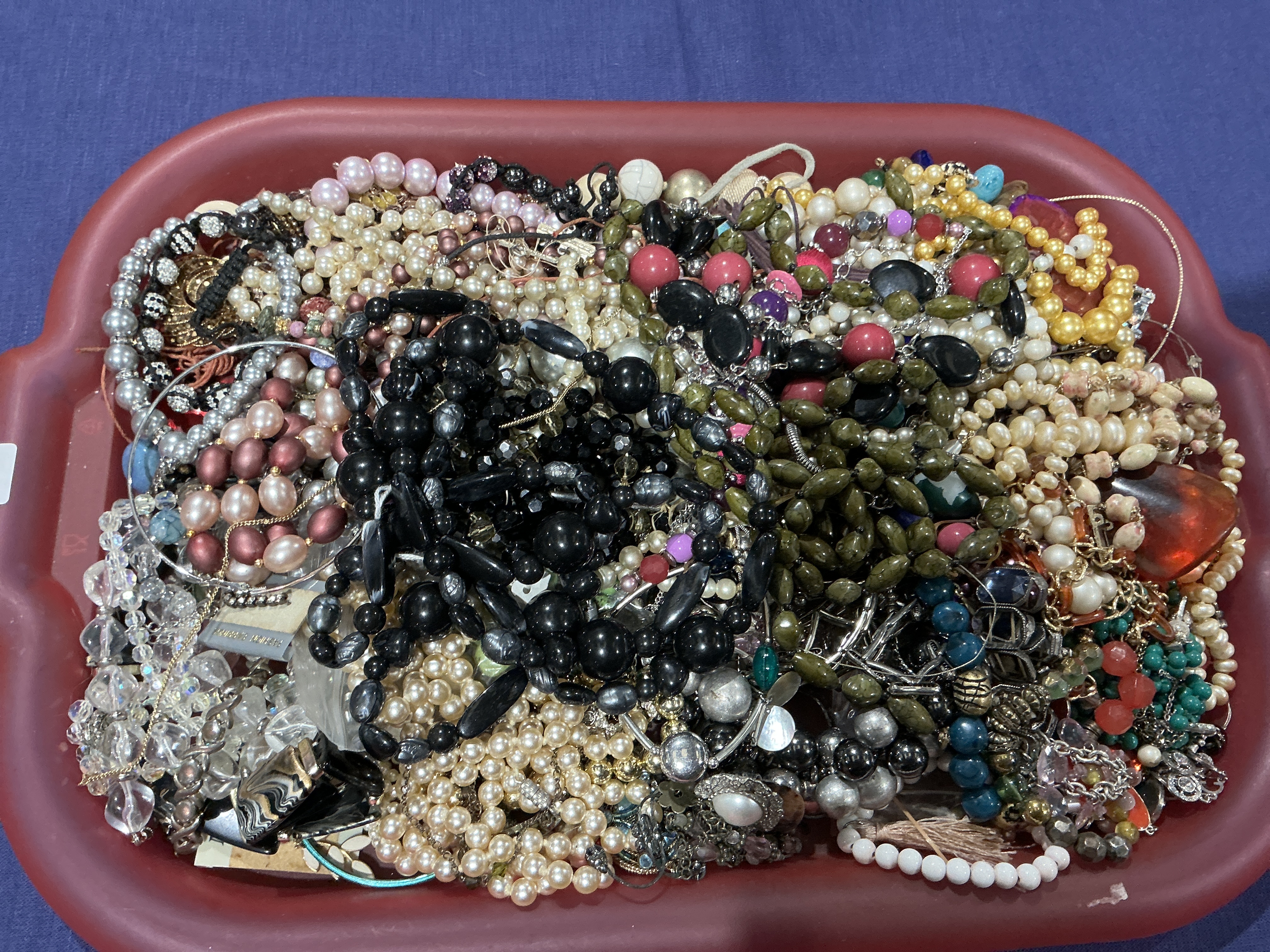 A collection of costume and fashion jewelry featuring an assortment of necklaces and bracelets. The group includes multiple strands of faux pearls in shades of white, cream, and pink, as well as beaded necklaces in black, red, forest green, and turquoise. Construction materials include molded plastic, faceted glass, metal chains, and composite beads. One item bears a silver-toned tag marked NAPIER. The collection is presented in an unsorted and tangled state.
