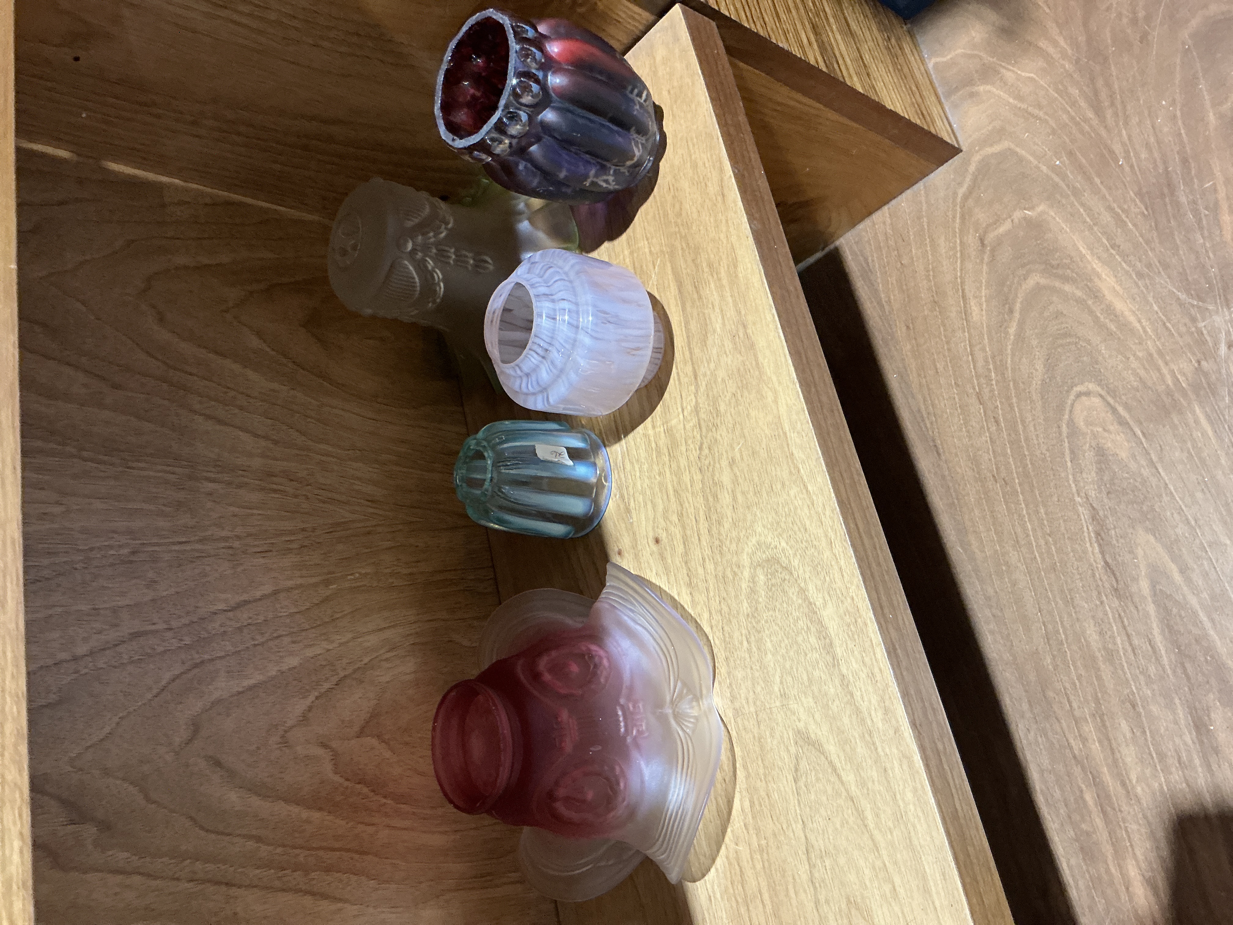 A collection of vintage glass lamp shades featuring various styles and finishes from the early-to-mid 20th century. The group includes a pink frosted glass shade with a wide flared rim and embossed geometric patterns; a small blue glass shade with vertical ribbing; a white opalescent glass shade with a swirled pattern; a clear frosted glass shade decorated with draped garland motifs; and a deep red to purple iridescent glass shade with heavy vertical ribbing and circular accents near the rim. The pieces are constructed from various types of pressed, satin, and opalescent glass. One shade retains a small, illegible inventory sticker.