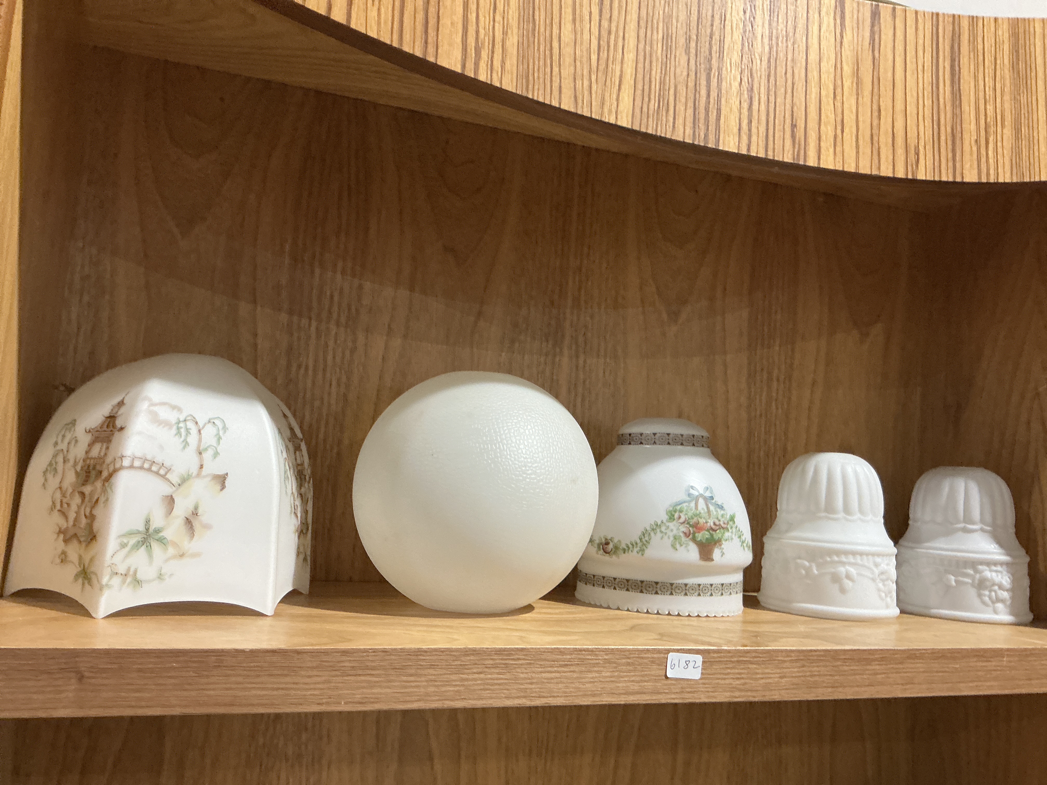 A collection of various opaque white and frosted glass lamp shades and covers in assorted styles. The group includes a large six-sided shade featuring a hand-painted Asian-inspired landscape with a pagoda and bridge, consistent with Art Deco retro designs. The collection also contains a spherical globe with a textured frosted surface and a bell-shaped shade decorated with a floral basket and garland motif. Additionally, there are smaller shades featuring relief-molded patterns. The items are constructed from milk glass and frosted glass. A small inventory sticker numbered 6182 is present on the shelf.