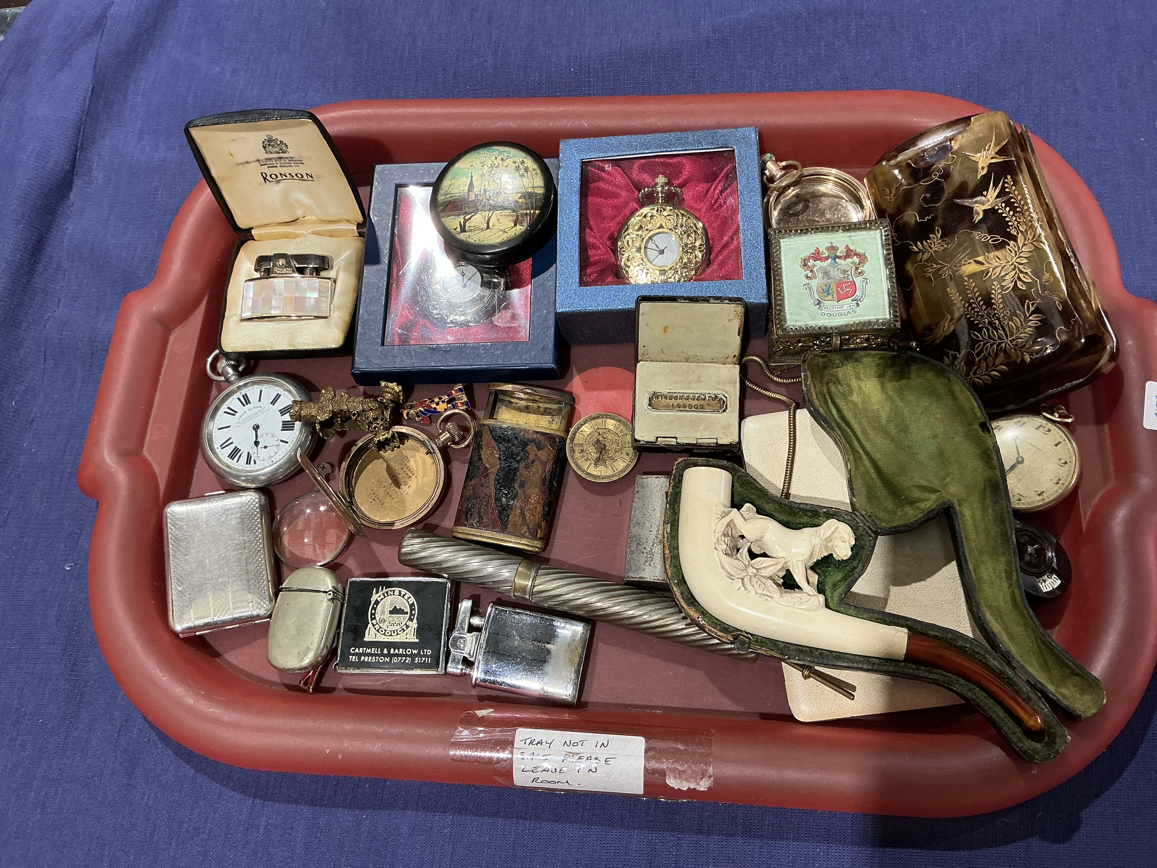 An assortment of various vintage and antique small collectibles and personal accessories. The collection includes multiple pocket watches in various states, some housed in original or presentation boxes. Featured lighters include a Ronson with mother-of-pearl patterned panels in its case and a matchbox sleeve for Cartmell & Barlow Ltd of Preston. The lot contains a carved meerschaum tobacco pipe depicting a dog, presented in a fitted, green velvet-lined case. Also included is a long, spiral-twisted metal rod, a small tortoiseshell-style cup with gilt bird and floral decorations, and various small metal boxes, one of which features a heraldic crest for Douglas. The items are composed of mixed materials including base and precious metals, meerschaum, and various decorative surfaces.