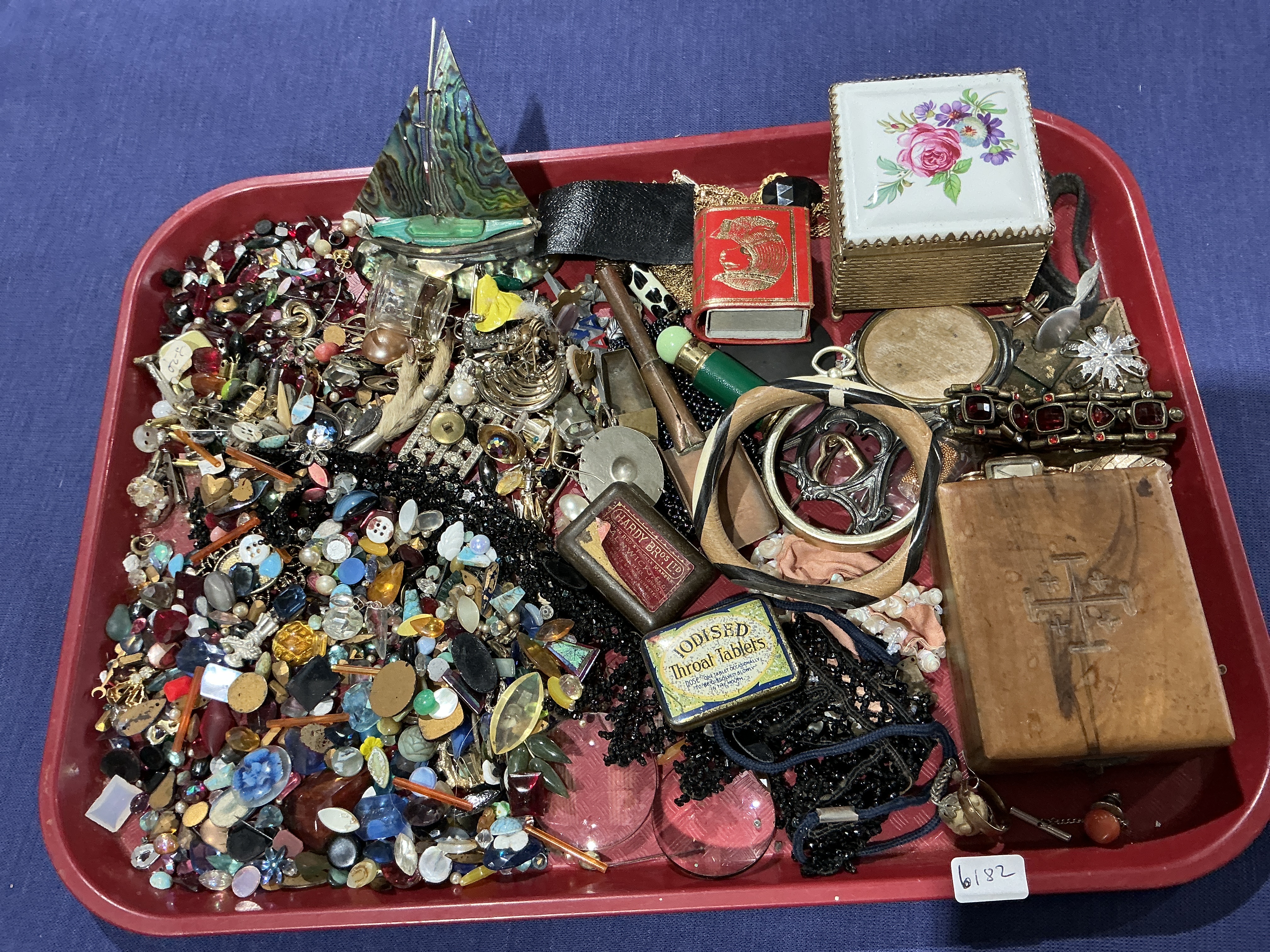 A collection of vintage and modern costume jewelry and mixed collectibles presented on a red plastic tray. The lot includes an abalone shell model of a sailboat, a porcelain trinket box with a floral transfer-decorated lid, and a small wooden box featuring an embossed Jerusalem cross. Also present are two vintage tins, one labeled Hardy Bros Ltd and the other Iodised Throat Tablets. The assortment contains a wide variety of loose beads, buttons, pins, earrings, and other jewelry findings in various materials, alongside a red stone-set bracelet, a small red and gold decorative book, and lengths of black beaded trim. This tray to repair costume jewelry is intended for hobbyists, crafters, or for parts.