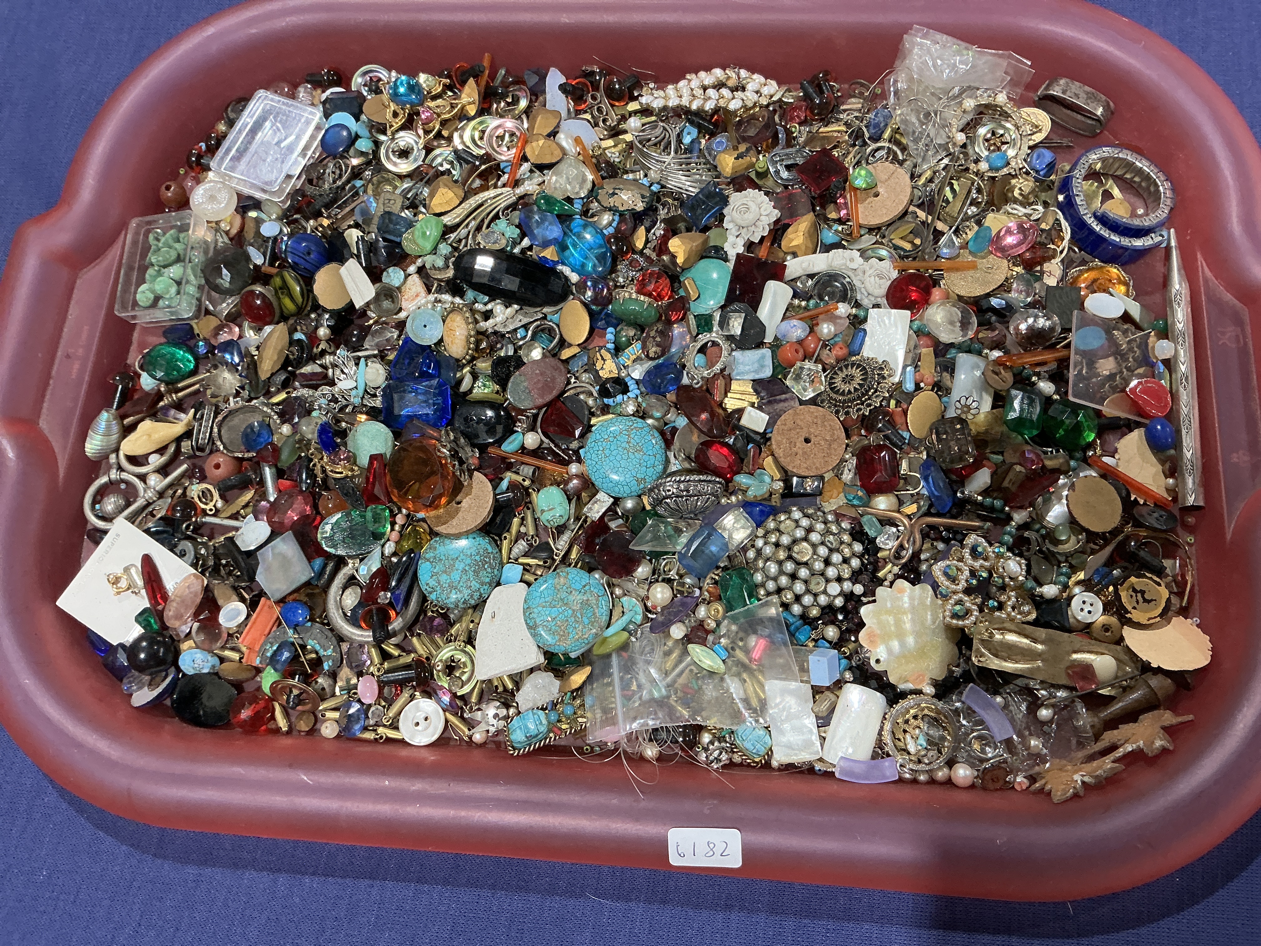 This collection consists of an assortment of vintage to modern costume jewelry and craft components presented in a red plastic tray. The lot includes various items such as brooches, earrings, necklaces, buttons, loose beads, pins, and small findings. Materials observed include gold- and silver-toned metals, faux pearls, faceted glass, plastic, mother-of-pearl, and turquoise-colored stones. The items are organized within a red plastic tray bearing lot tag 6182.