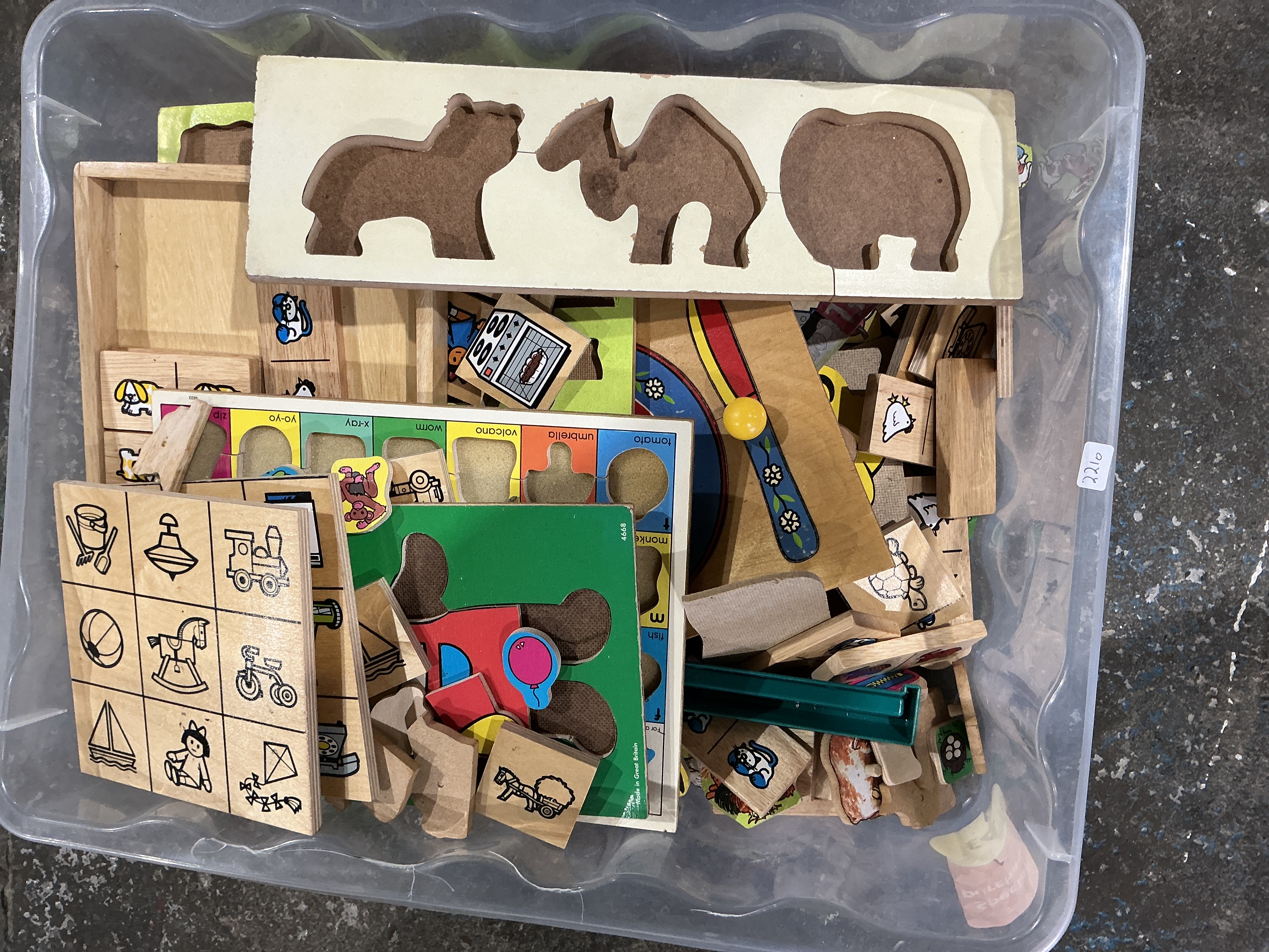 A collection of vintage wooden educational toys and puzzles featuring various inset boards and loose components. The items are constructed primarily of wood with printed or screen-applied graphics. Themes include animal silhouettes, everyday objects, a clock face, and an alphabetical word-association board with terms such as tomato, umbrella, and volcano. Some components bear the marking Made in Great Britain. The lot is housed in a clear plastic storage bin.