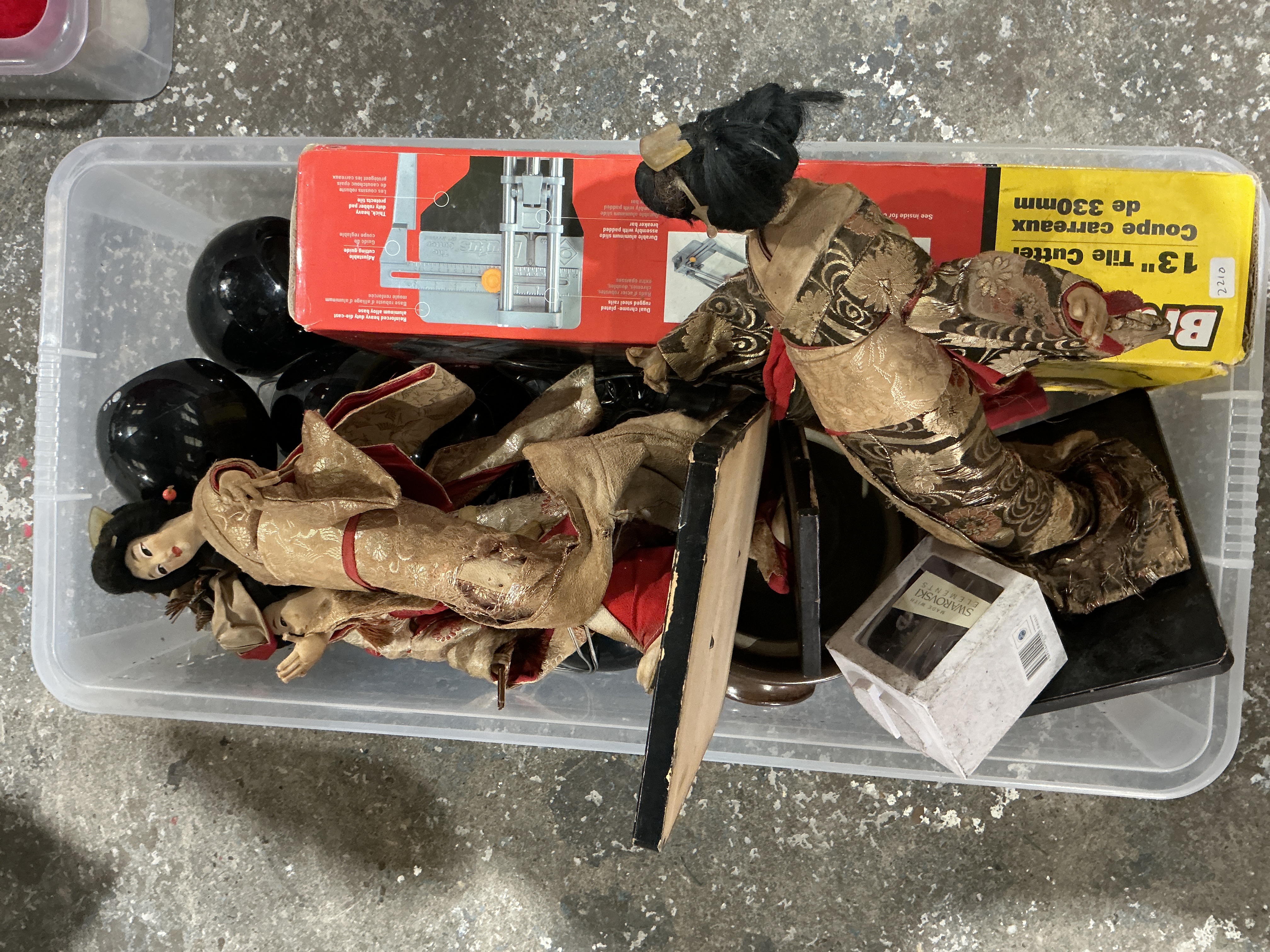 A collection of vintage Japanese dolls and assorted household goods. The dolls are dressed in traditional patterned kimonos featuring metallic thread accents. The lot includes a boxed Brite 13-inch tile cutter and several polished black spheres, one of which displays an LG logo. Also present is a small boxed item labeled Made with Swarovski Elements. The items are contained within a clear plastic storage bin.