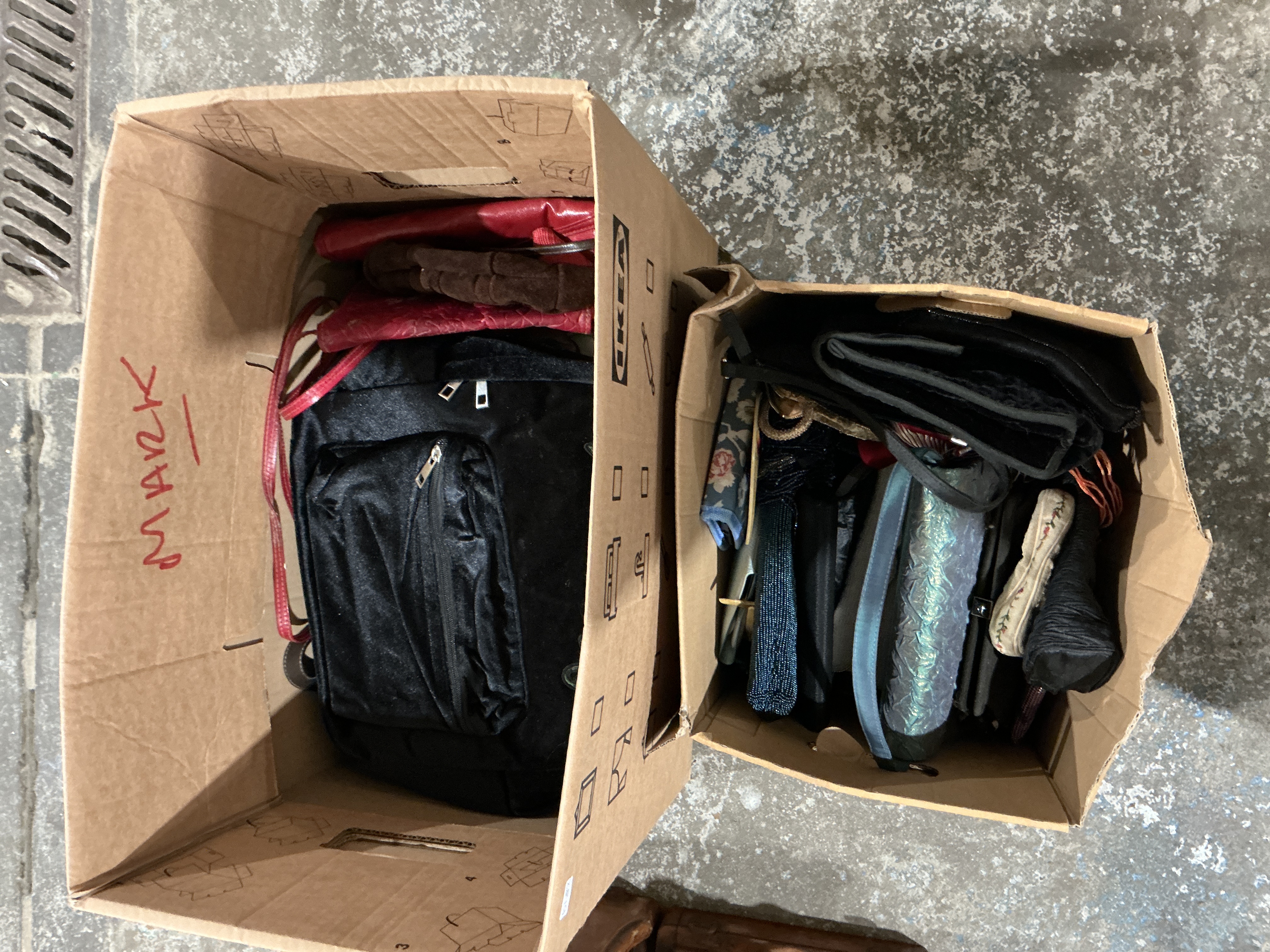 An assortment of personal accessories and vintage-style toys contained within two cardboard boxes and a black plastic crate. The accessory group includes various handbags, a black velvet backpack with zippered compartments, and multiple evening clutches featuring beaded, floral, and iridescent textile finishes. The toy collection comprises several hand puppets with molded heads depicting characters including a policeman, a devil, a king, and a female figure. Additional items include a large black plush cat with a decorative ribbon, a plastic toy car containing a seated figure, and a wooden toy component. One cardboard box bears the name MARK in red ink, and the plastic crate displays a numbered auction lot sticker 6182.