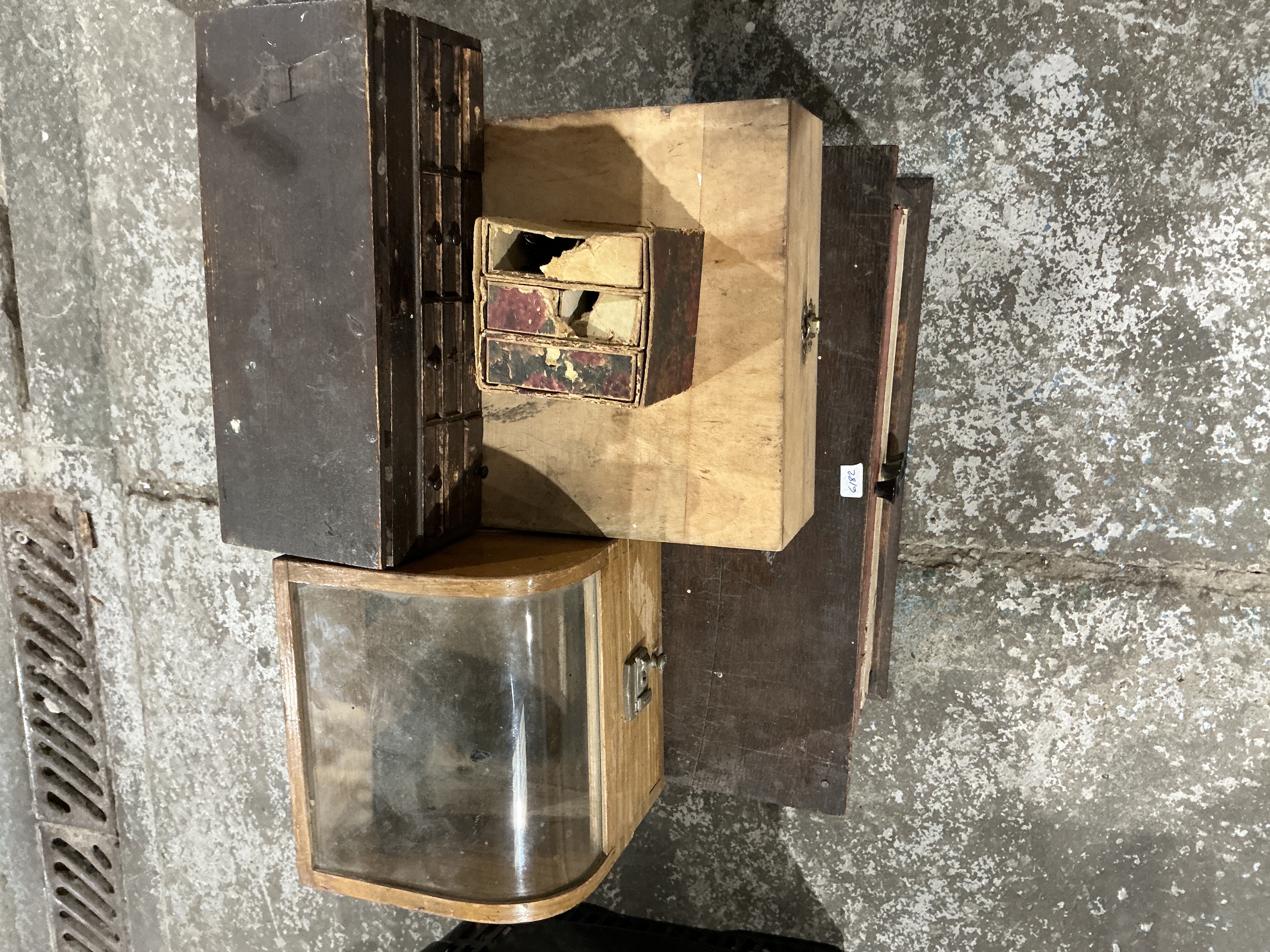 An assortment of vintage and antique storage containers and display pieces. The group includes a miniature apothecary-style chest with multiple small drawers and metal pulls, a countertop display cabinet featuring a curved glass front and wooden frame, and a utilitarian pine storage box with metal hardware. Also included is a small paperboard chest with patterned drawer fronts. Construction materials primarily consist of assorted woods, metal hardware, glass, and cardboard. A white adhesive label with the handwritten number 6182 is present on one of the larger wooden pieces.