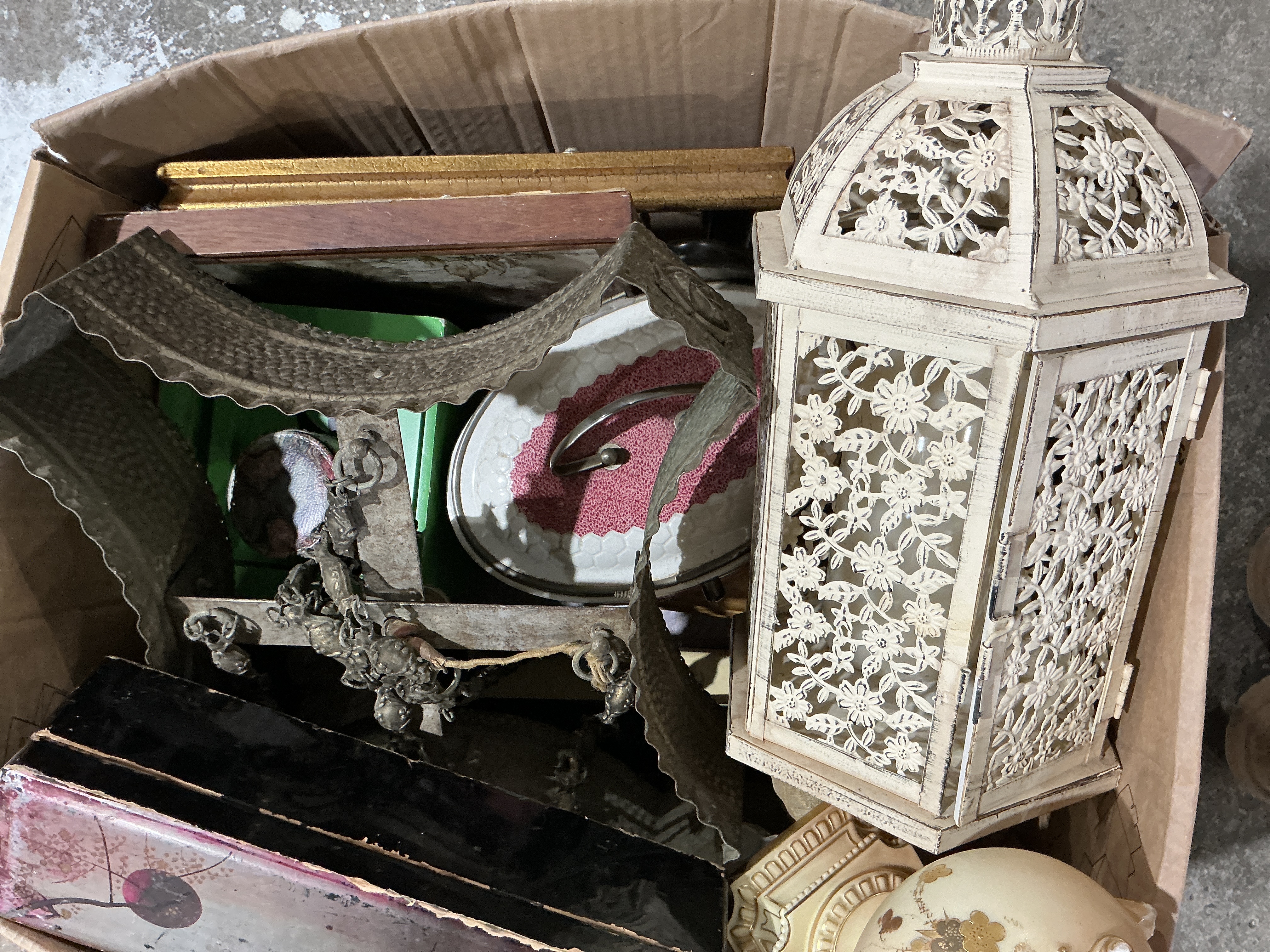 A collection of various decorative home goods and household items. The group features a white-painted metal lantern in the Moroccan style, characterized by intricate floral cut-out panels, a domed top, and a distressed finish. Also included is an ornate, hammered metal decorative piece with suspended chains and accents. The lot further contains a black lacquered box with pink floral designs, multiple framed items in wood and gilt-tone frames, a white and pink ceramic tray, and a piece of porcelain with floral and gilt-edged details. These items are constructed from materials including metal, wood, glass, lacquer, and ceramic.