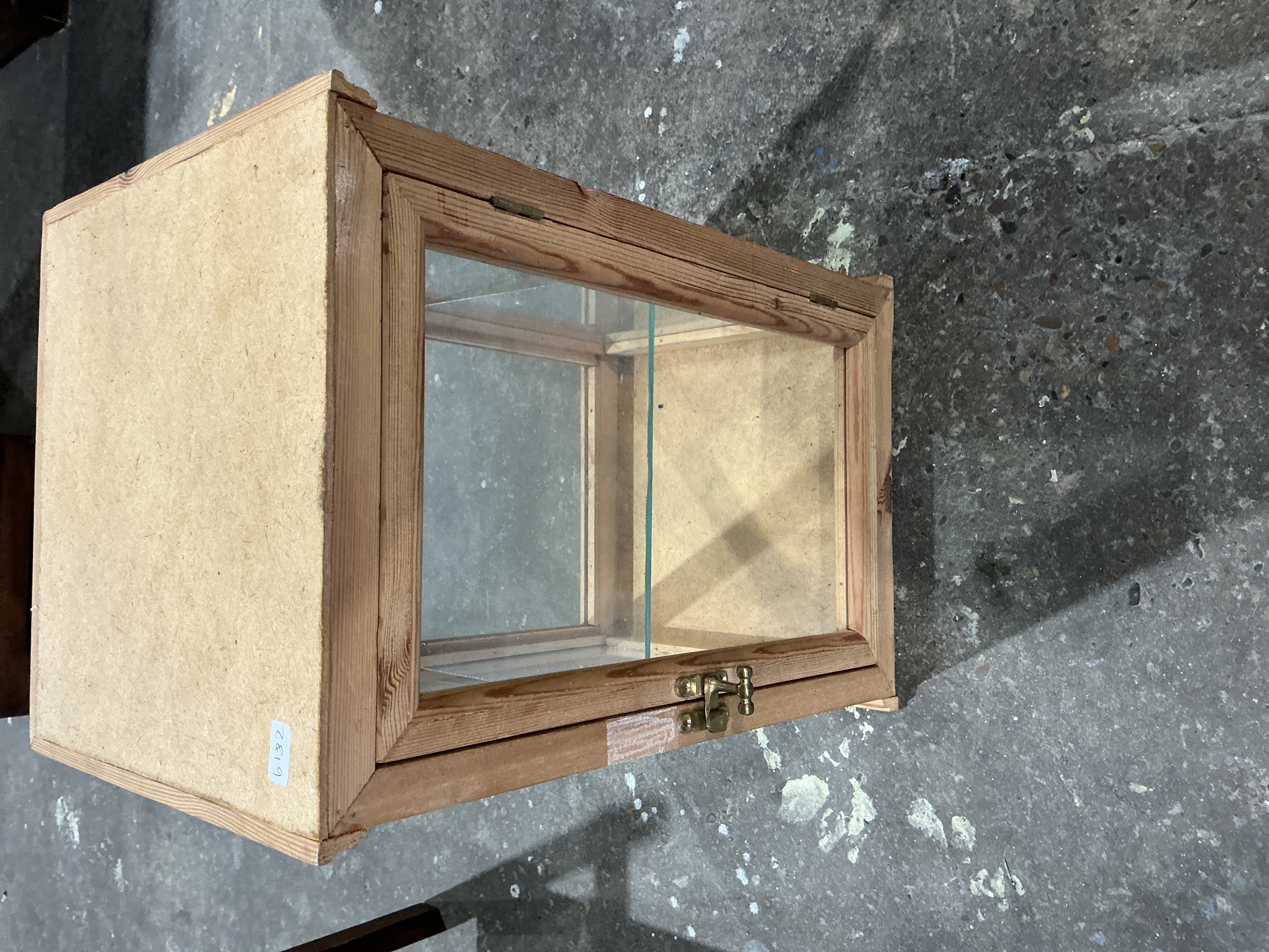 A wooden countertop display case of utilitarian design. The piece is constructed with a light-toned wood frame and features glass-inset panels. One panel is composed of fiberboard and bears a small white adhesive label with the number 6132. The case includes a single hinged door secured by a brass-toned metal latch.