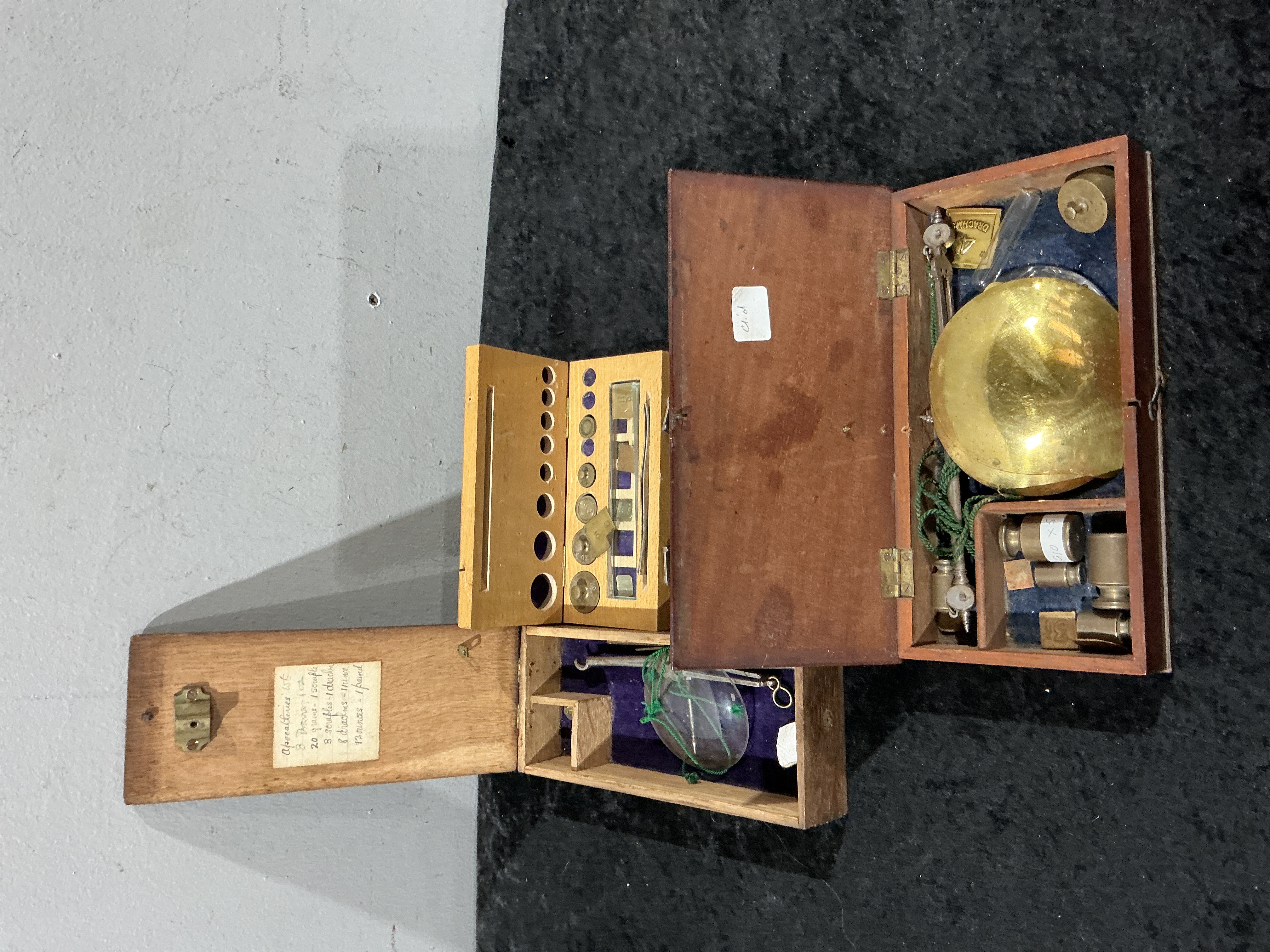 This lot comprises three antique apothecary scale sets, each housed in a fitted wooden case with a hinged lid. The sets include brass balance scales, glass pans, and glass vials. The collection features an assortment of brass weights in cylindrical and flat forms. The cases are lined with fabric in shades of blue and purple. One case lid contains a handwritten paper label detailing traditional apothecary weight measurements, including grains, scruples, drachms, and ounces. Visible markings on the components include weight denominations such as 4 DRACHMS. One case lid has a small adhesive label reading child.