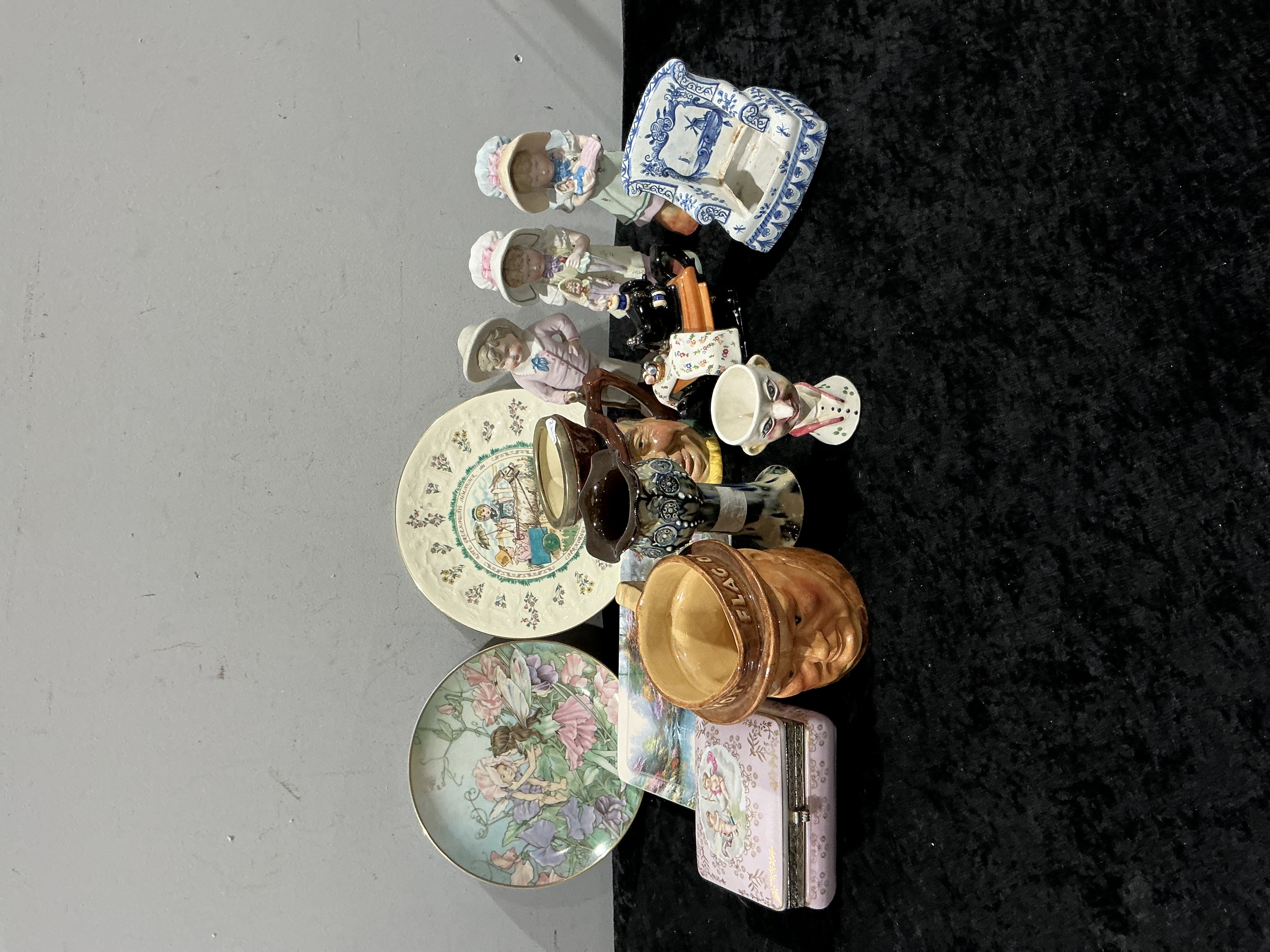 A collection of various ceramic and decorative items featuring a Beswick relief-molded vase with abstract dark blue and green decoration and a blue and white glazed ceramic jardiniere depicting windmill and sailboat motifs. The group includes a Dudson-style brown glazed ceramic jug with embossed text reading FLAG ON and a character jug depicting a male face. Also present are several figurines of children in wide-brimmed hats and period-style attire, a face-shaped vessel, and a pink patterned trinket box with a hinged metal lid. The lot is completed by two decorative plates, one featuring a winged fairy among pink flowers and the other displaying a central narrative scene with a floral patterned border.