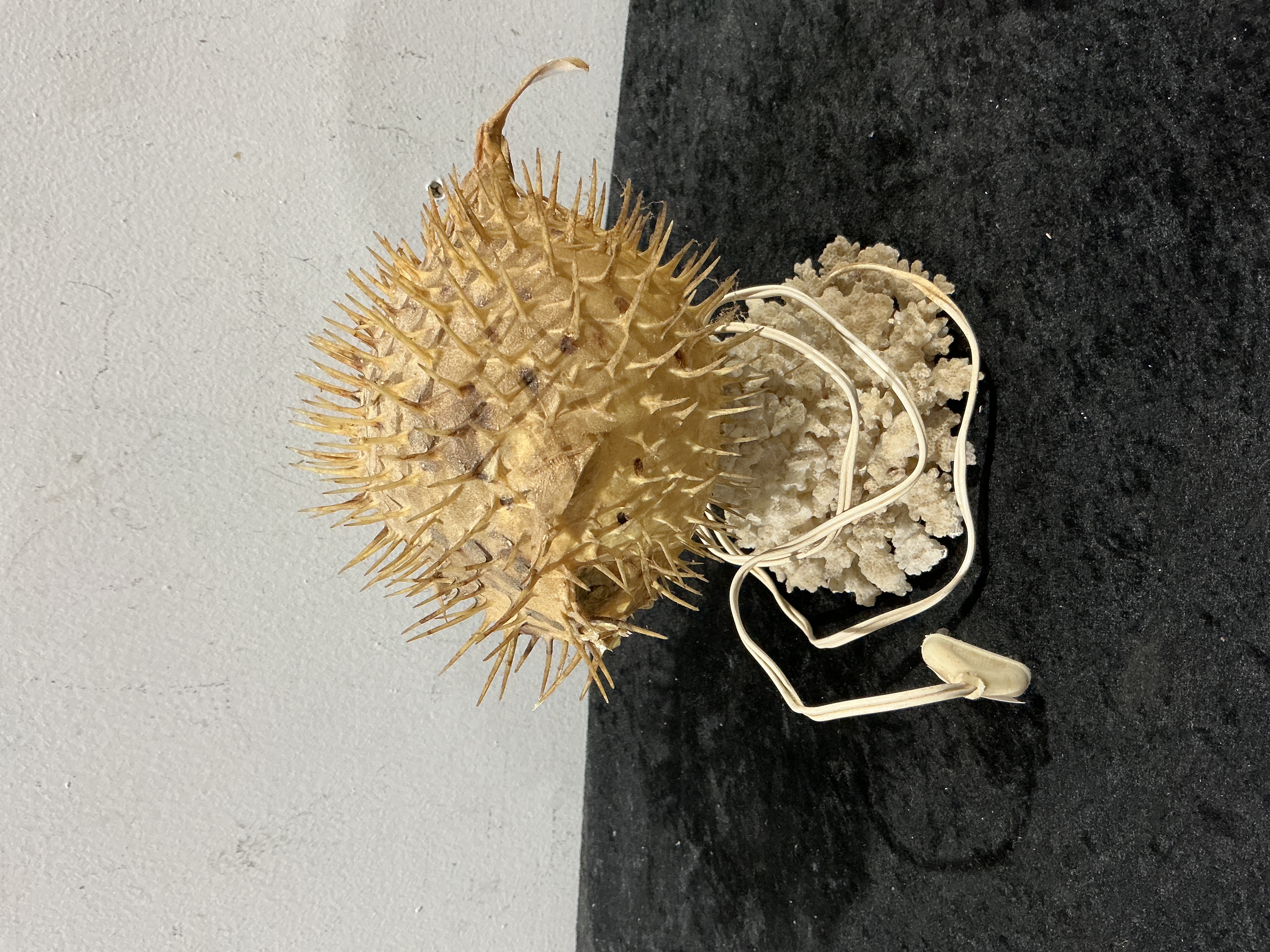 This lot consists of a taxidermy puffa fish and a specimen of branching coral. The puffa fish is preserved in an inflated, spherical form, featuring a dense arrangement of sharp, radiating spines and naturally dried skin in shades of yellowish-tan and brown. The accompanying coral specimen is off-white with a textured, branching structure. Also included is a length of white cord for plug