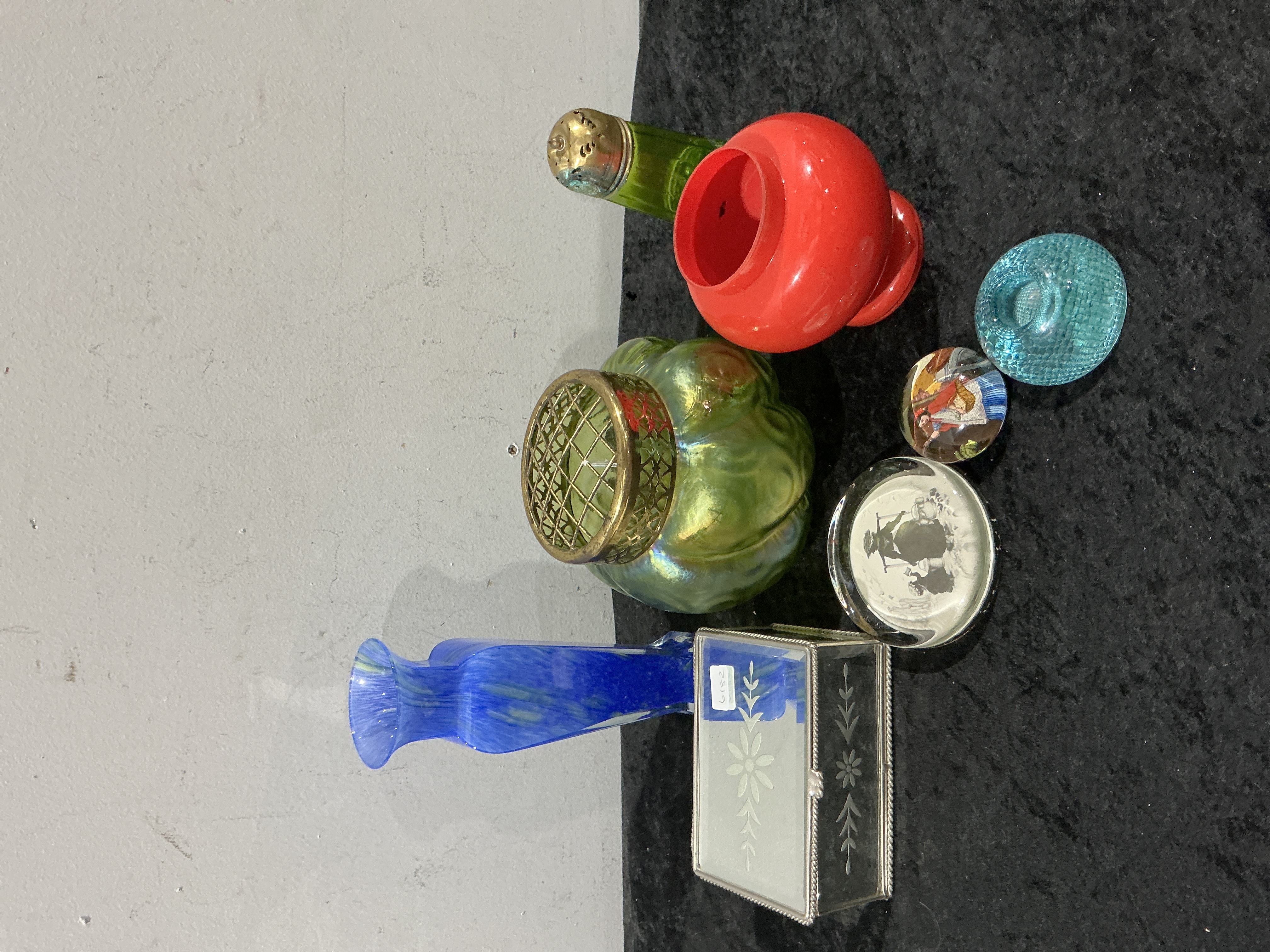 A collection of decorative glass and household objects, featuring a Bohemian Art Nouveau iridescent green glass vase, attributed to Loetz or Kralik, with a pinched bulbous form and a brass-toned metal flower frog insert. The group includes a tall blue-toned glass vase with a textured, elongated body and flared rim, a vibrant red glass vessel with a bulbous body, and a rectangular mirrored trinket box with etched floral patterns and metal edging. Also present is a small green glass shaker with a perforated metal lid and several glass paperweights, including one with a black and white scenic insert, a smaller one with a colorful illustration, and a turquoise-colored textured glass piece.