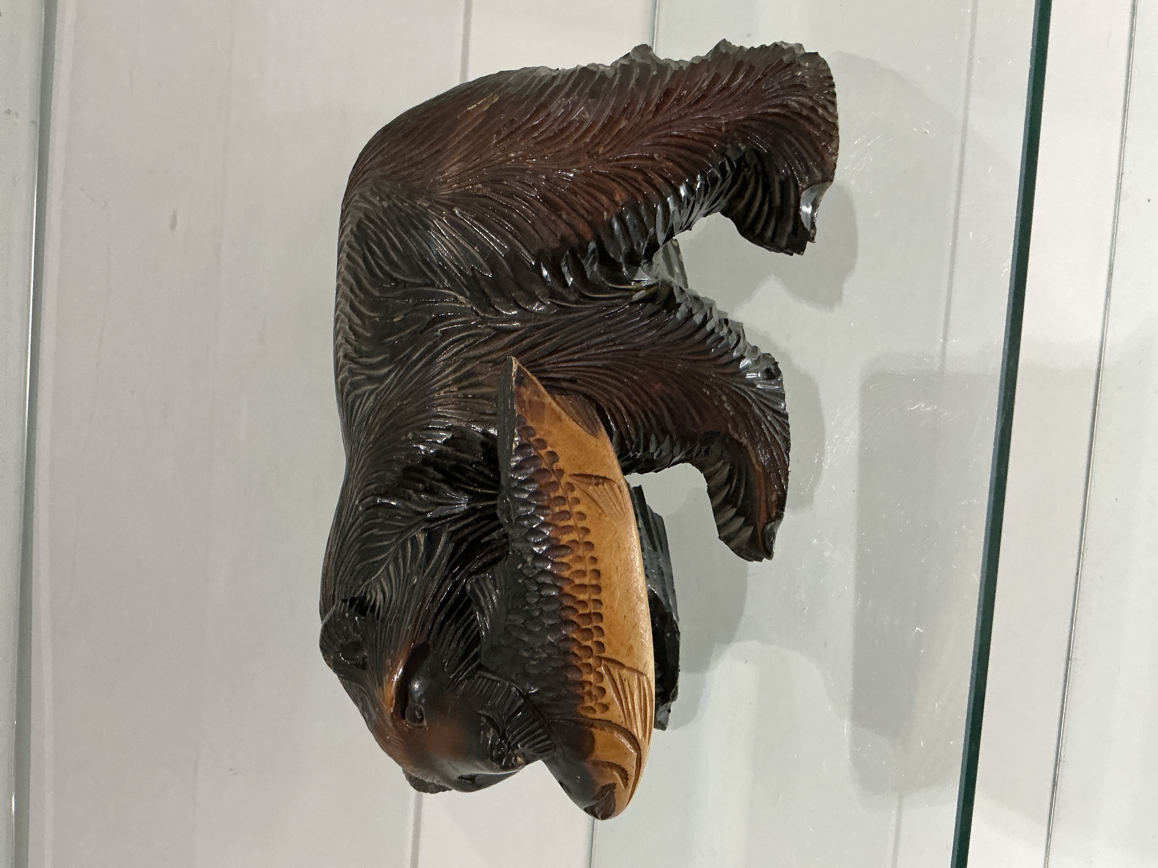 Japanese Wooden Hokkaido Ainu Bear Carving has damage to tail of fish