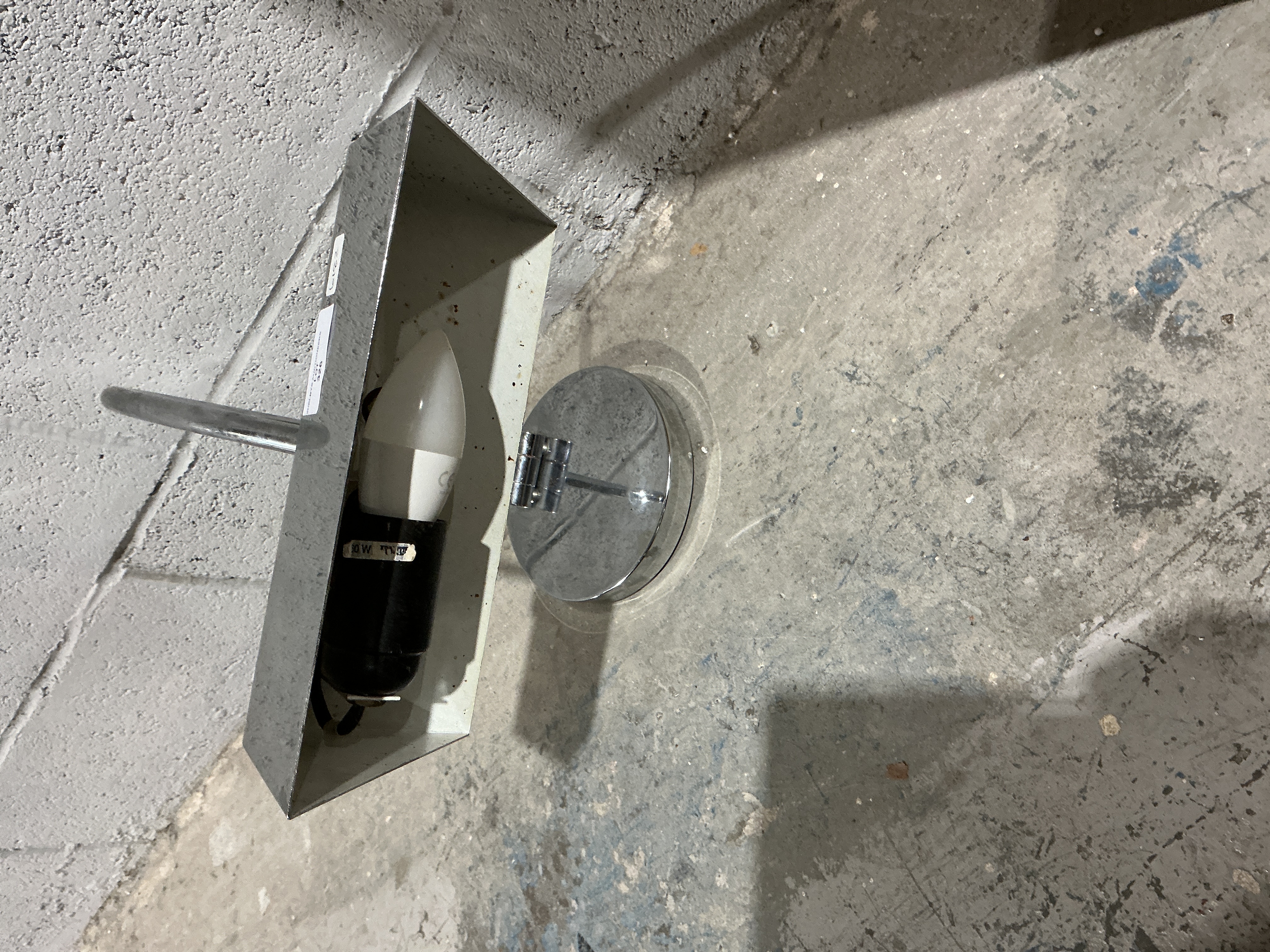 A vintage task lamp featuring a rectangular metal shade with a gray finish, supported by a curved chrome-plated arm and a weighted circular base. The interior of the shade houses a single socket, currently fitted with a flame-style bulb, and displays a label specifying a maximum wattage of 40W for an E14 base. An identification sticker is visible on the exterior of the shade. The fixture is presented in its current state with no wire attached and needs a rewire to be made functional.