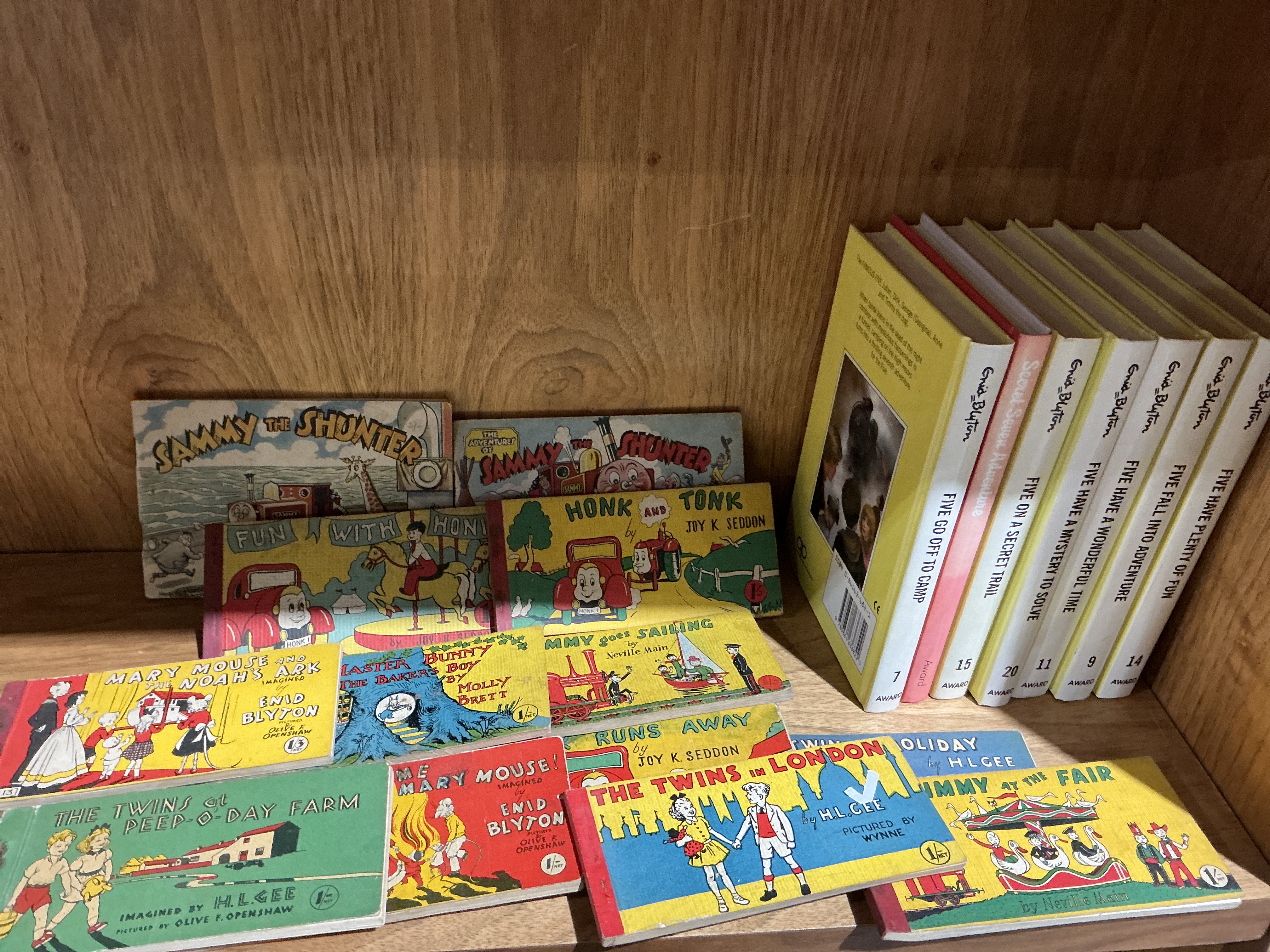 A selection of vintage children’s books primarily from the mid-20th century and published in the United Kingdom. The collection includes various landscape-format pocket books such as Enid Blyton’s Mary Mouse series, the Sammy the Shunter series by Neville Main, Honk and Tonk by Joy K. Seddon, and The Twins series by H.L. Gee. Also included is a group of upright paperbacks by Enid Blyton featuring titles from the Famous Five and Secret Seven series published by Award. The books are composed of illustrated cardboard or stiff paper covers with paper pages. Several of the small-format editions feature original 1/- net price markings on the front covers.