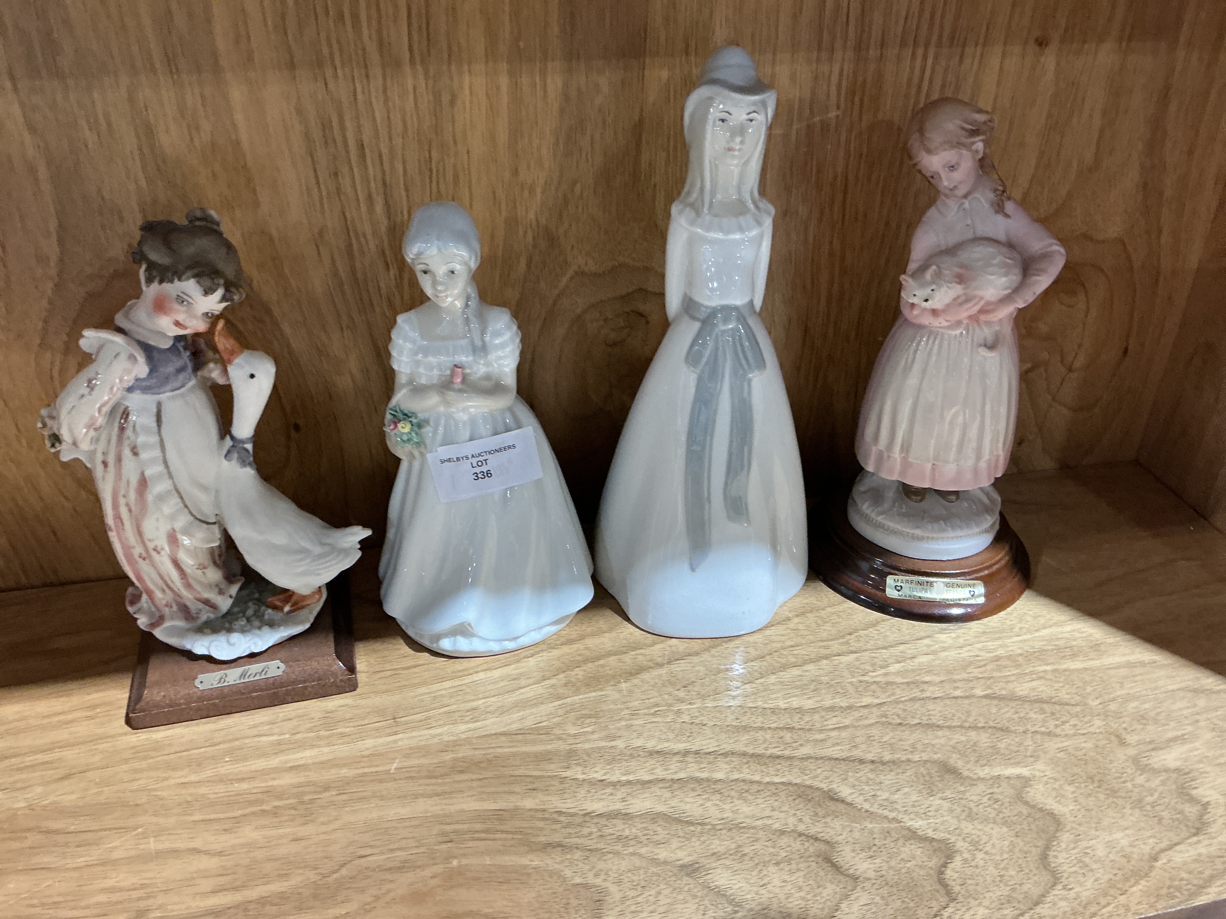 A collection of porcelain figurines primarily representing young female figures. The group includes an elongated, stylized figure of a woman with a grey sash, bearing the underglaze blue stamp for Porcelanas Miquel Requena S.A., Cuart de Poblet, Valencia. Also included is a hand-painted porcelain figure of a girl holding flowers, marked for Porceval, Villamarchante, Valencia. The collection also features a polychrome figurine of a girl with a goose mounted on a wooden base with a B. Merli plaque, and a figurine of a girl holding a pet on a circular wooden base with a Mareinite Genuine label. The Spanish porcelain pieces feature a high-gloss glaze and a color palette consistent with the Valencia region.