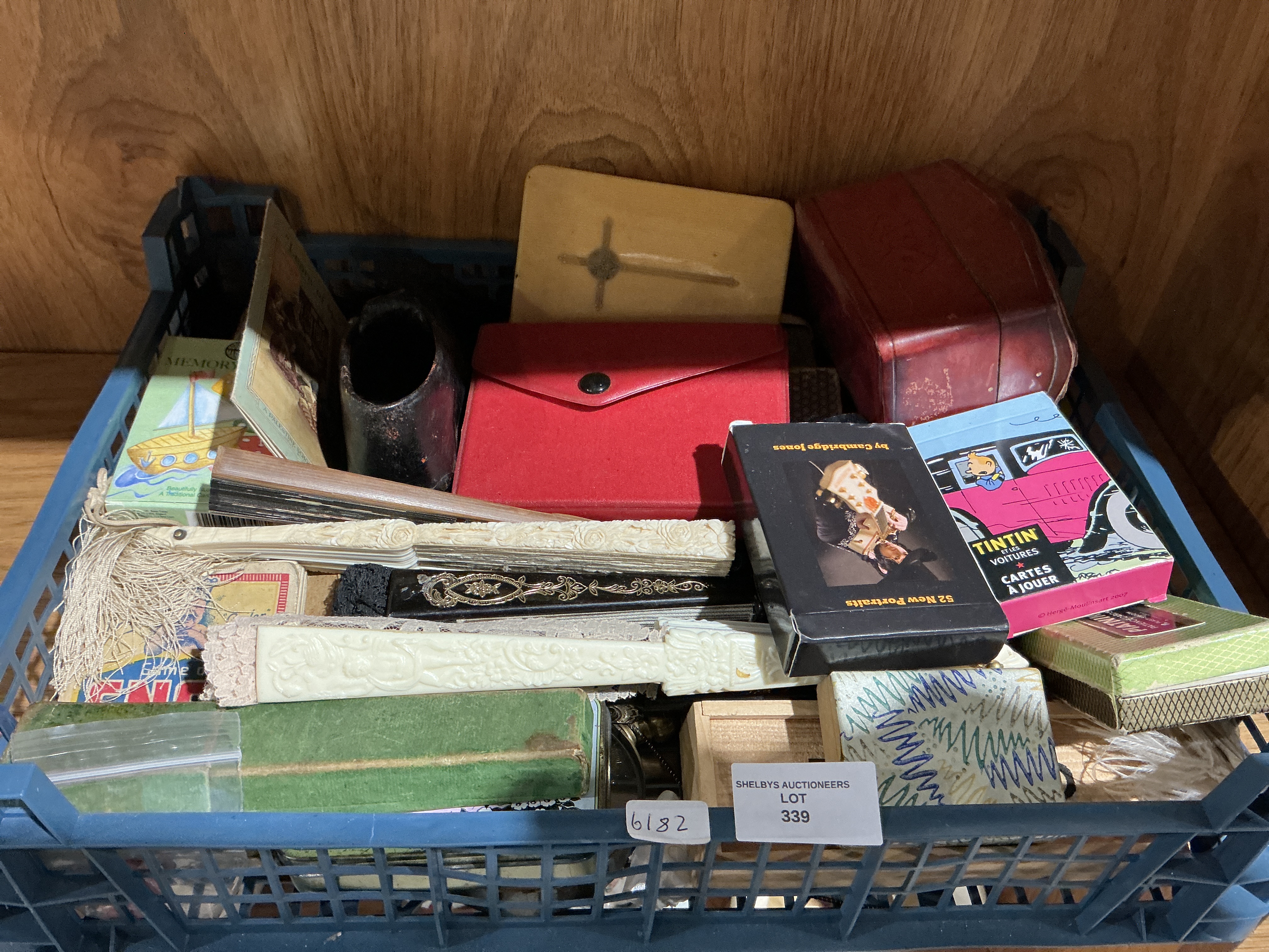 A collection of various collectibles and small decorative items. The group includes several boxed sets of playing cards, notably a Tintin-themed set titled Tintin et les Voitures Cartes a Jouer and a pack labeled 52 New Portraits by Cambridge Jones. The lot features multiple hand fans, including one with white carved guards and a tassel and another in black with gold-tone accents. Additional items comprise small storage boxes in various materials such as wood, paperboard, and leatherette, a red fabric pouch, a small black ceramic vessel, and various pieces of vintage ephemera and packaging.