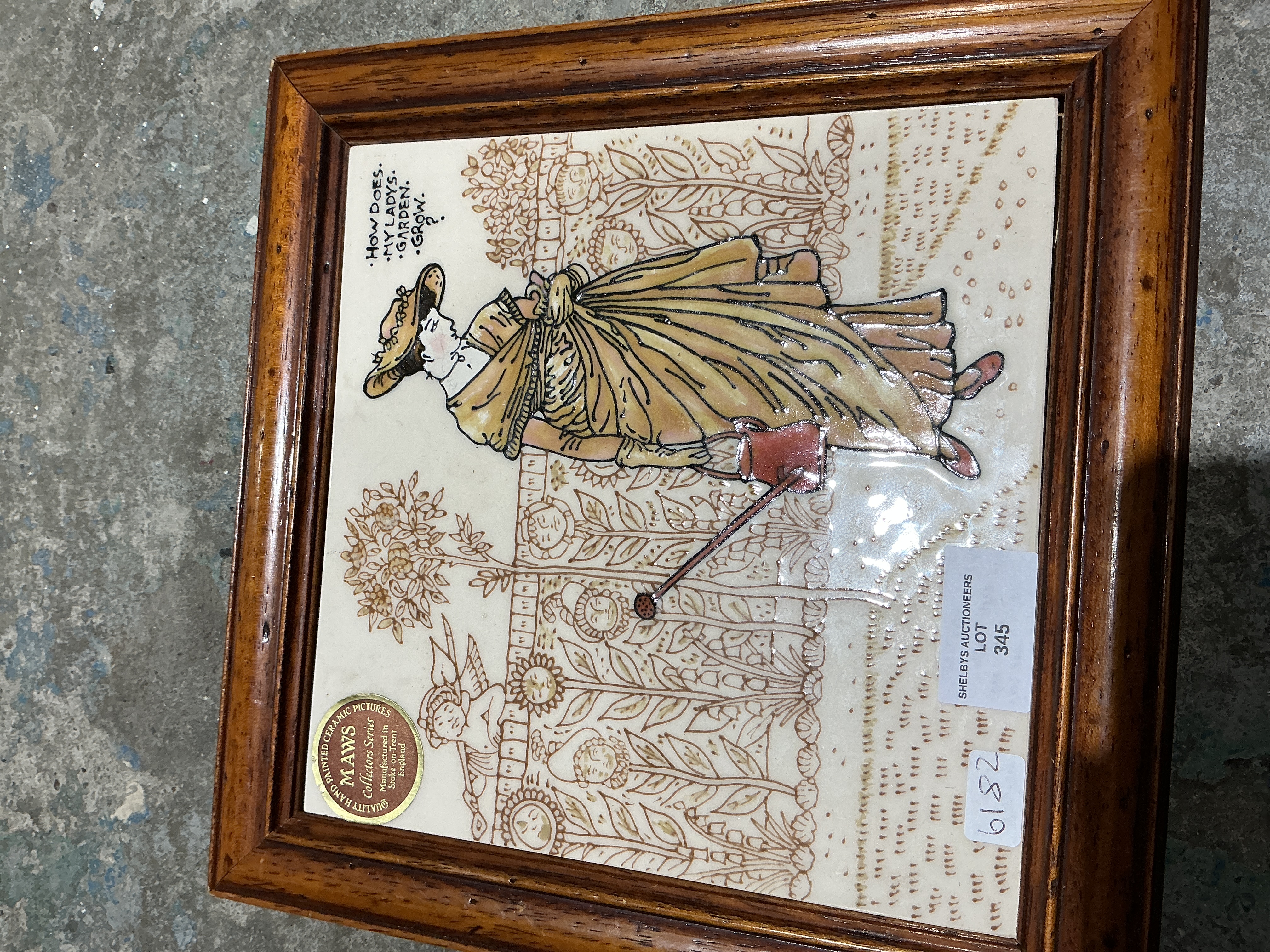 This hand-painted ceramic tile is part of the Maws Collectors Series, manufactured in Stoke-on-Trent, England. The tile is mounted within a polished wooden frame. The central illustration, executed in an Arts and Crafts style, depicts a woman in a wide-brimmed hat tending to a garden with a watering can. The upper left corner features hand-lettered text reading HOW DOES MY LADYS GARDEN GROW?. The color palette consists of ochre, sienna, and earth tones finished with a glossy glaze. A circular gold-toned manufacturer label is located in the lower left corner, identifying the piece as a Quality Hand Painted Ceramic Picture from the Maws Collectors Series. Auction lot tags are adhered to the right side of the tile surface.