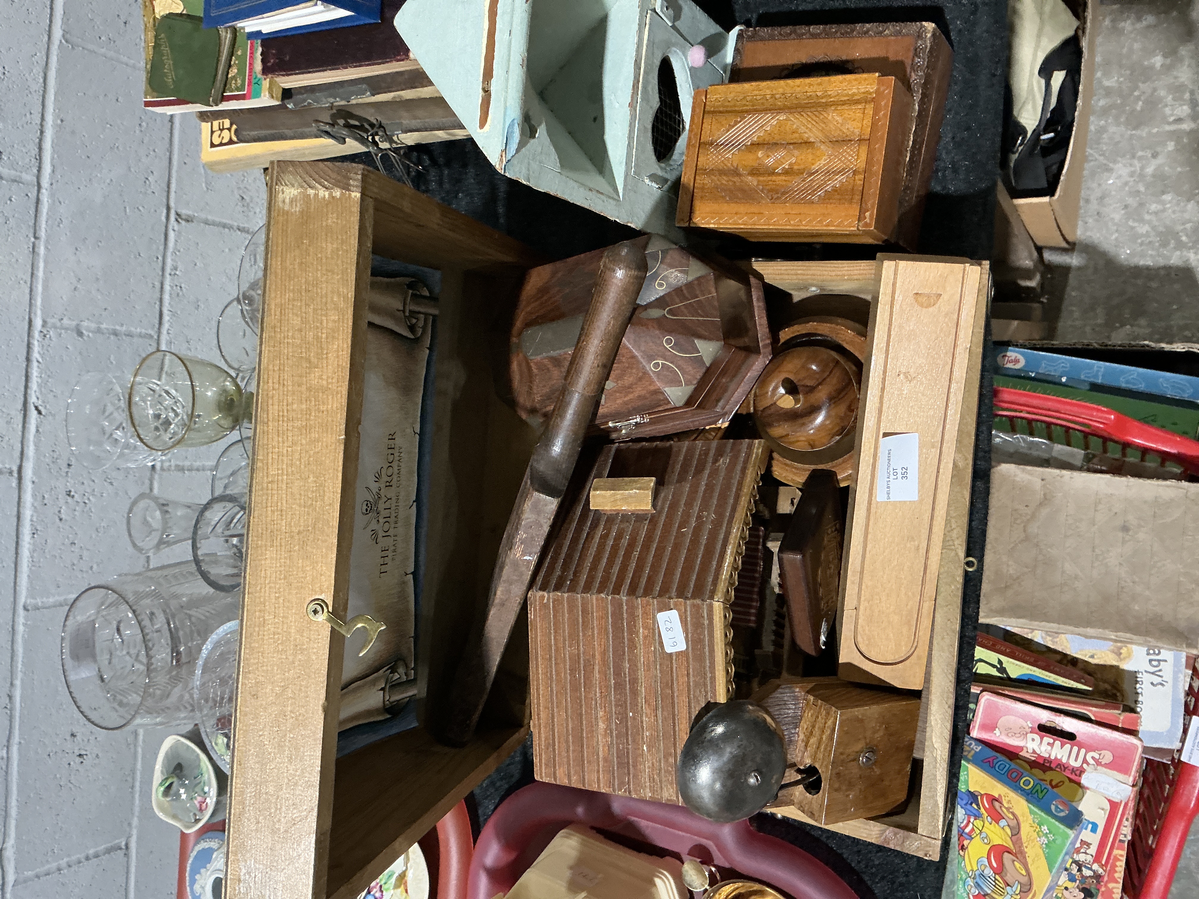 An assortment of various wooden items and decorative objects, primarily contained within a large pine-finished box. The primary container features a hinged lid with an interior label for The Jolly Roger Pirate Trading Company. The contents include a miniature slatted wooden house-shaped bank, an inlaid wooden trinket box with decorative scrollwork and geometric patterns, and a small metal bell mounted on a wooden block. Also present are several turned wood containers, a small sliding-lid box, and a light blue painted birdhouse-style object. One item retains an auction tag from Shelbys Auctioneers for Lot 352, and another bears a small white adhesive label numbered 6182. The items are constructed from various woods, metal, and paper.