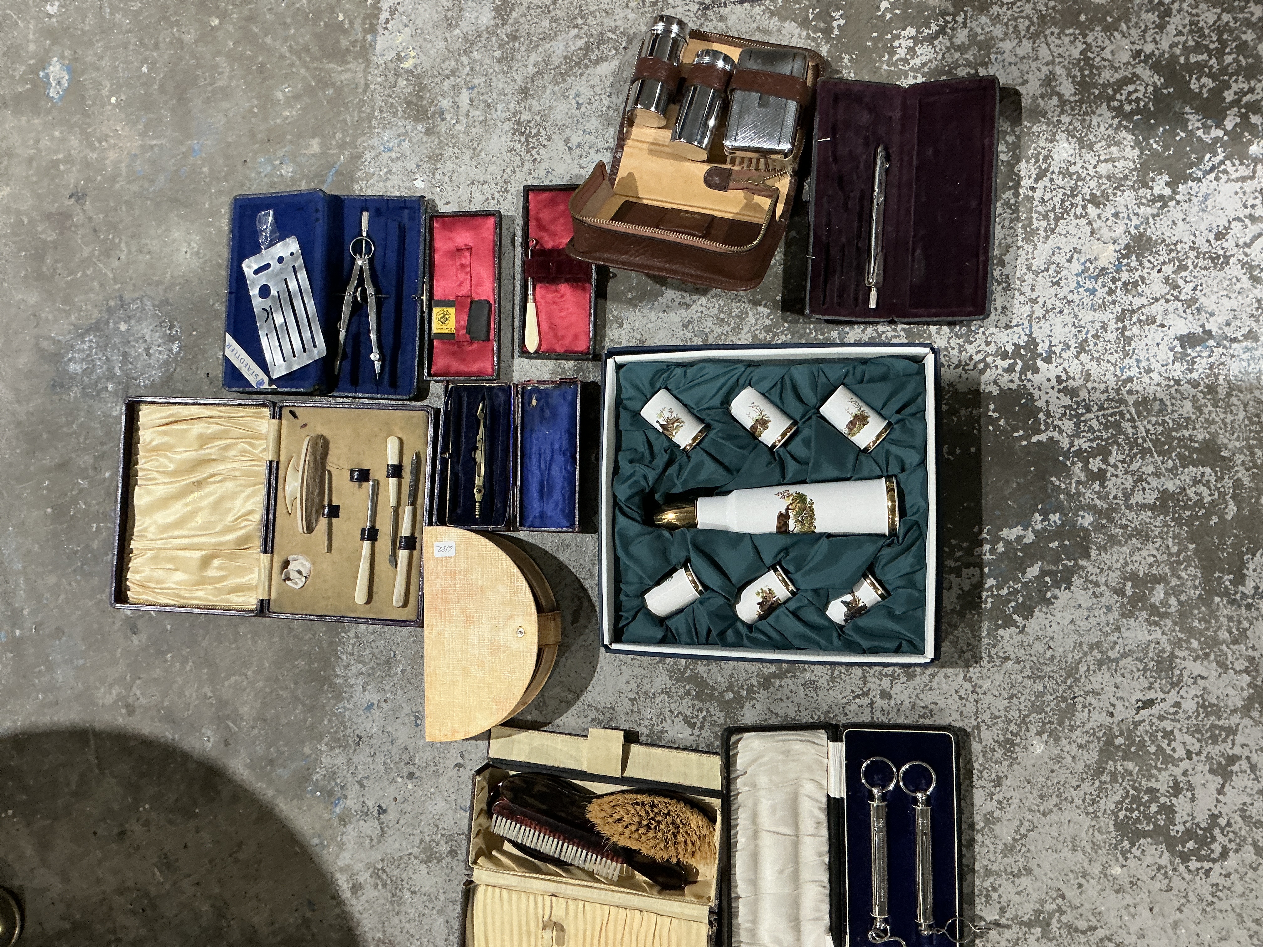 This collection comprises an assortment of vintage and antique cased sets including drafting and scientific instruments, personal grooming kits, and decorative barware. The group features a Staedtler drafting set with metal compasses and a ruler in a blue velvet-lined case. A leather-cased travel set contains metal flasks and cups. A porcelain beverage service is housed in a large presentation box with a green fabric lining, featuring a decanter and several small cups decorated with wildlife-themed transfer prints. Additional items include a cased brush set, a kit of manicure or sewing tools with bone-colored handles, and several smaller individual cased instruments in velvet or silk-lined boxes. The pieces are constructed from materials such as brass, silver-toned metal, wood, leather, and porcelain.