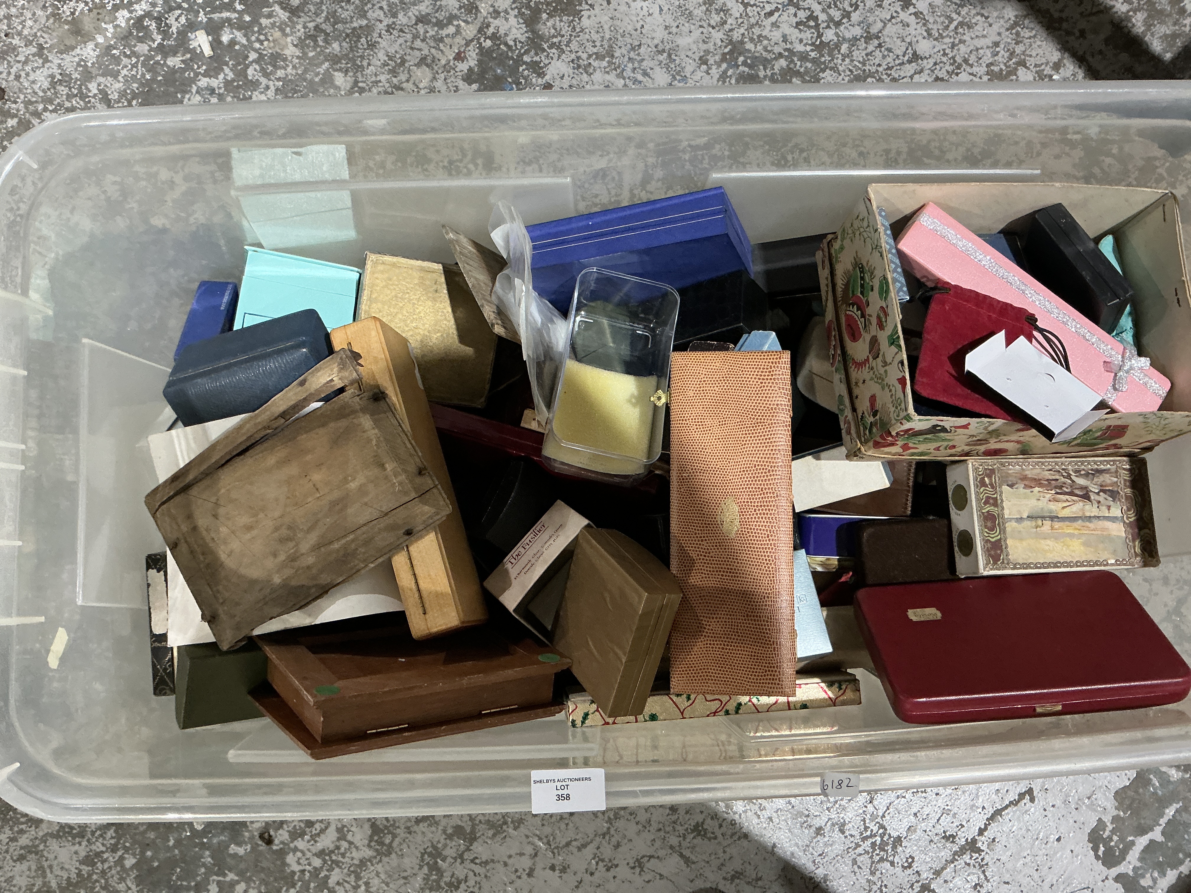 A collection of various presentation and gift boxes of various shapes and sizes. The assortment includes items constructed from wood, cardboard, plastic, and faux leather. Notable pieces include several wooden boxes with various finishes, a long textured tan presentation case, a red hardshell case, and a cardboard box featuring a floral pattern. One small white box bears the inscription ‘The Fusilier’. The items are suitable for the storage or presentation of jewelry, watches, coins, and other small collectibles. The lot is housed within a large clear plastic storage bin.