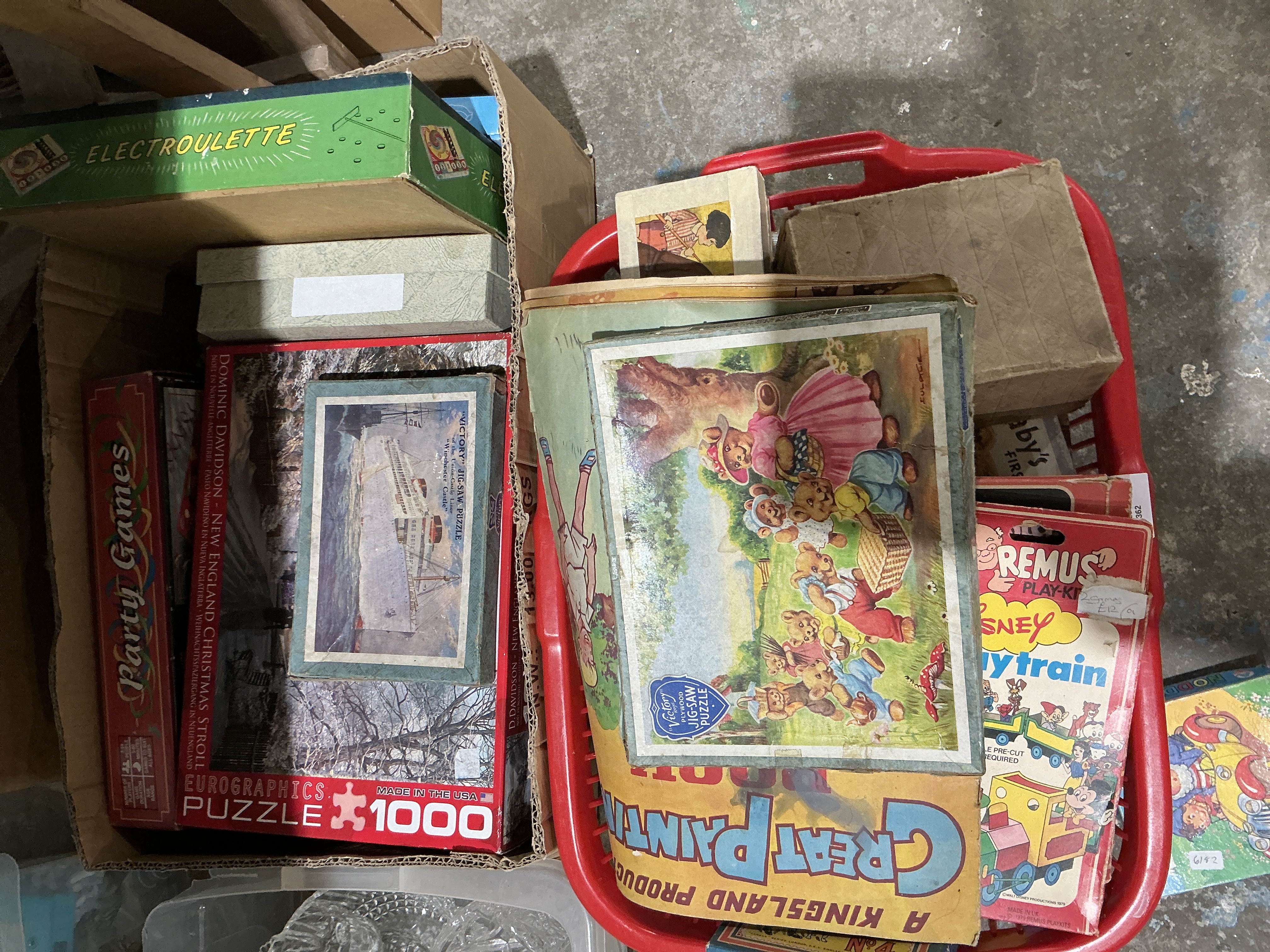 This collection features an assortment of vintage children’s games, activity sets, and puzzles. Primary items include several Victory brand plywood jigsaw puzzles, with subjects including the ocean liner Winchester Castle and a bear picnic illustration. The group also contains a 1000-piece Eurographics puzzle titled Dominic Davidson – New England Christmas Stroll, an Electroulette game, and a Party Games box. Additional items include a Remus Play-Kit for Disney Sky Train, a Great Painting book by Kingsland Products, and a Noddy themed puzzle. The items are primarily constructed from printed cardboard, paper, and plywood.