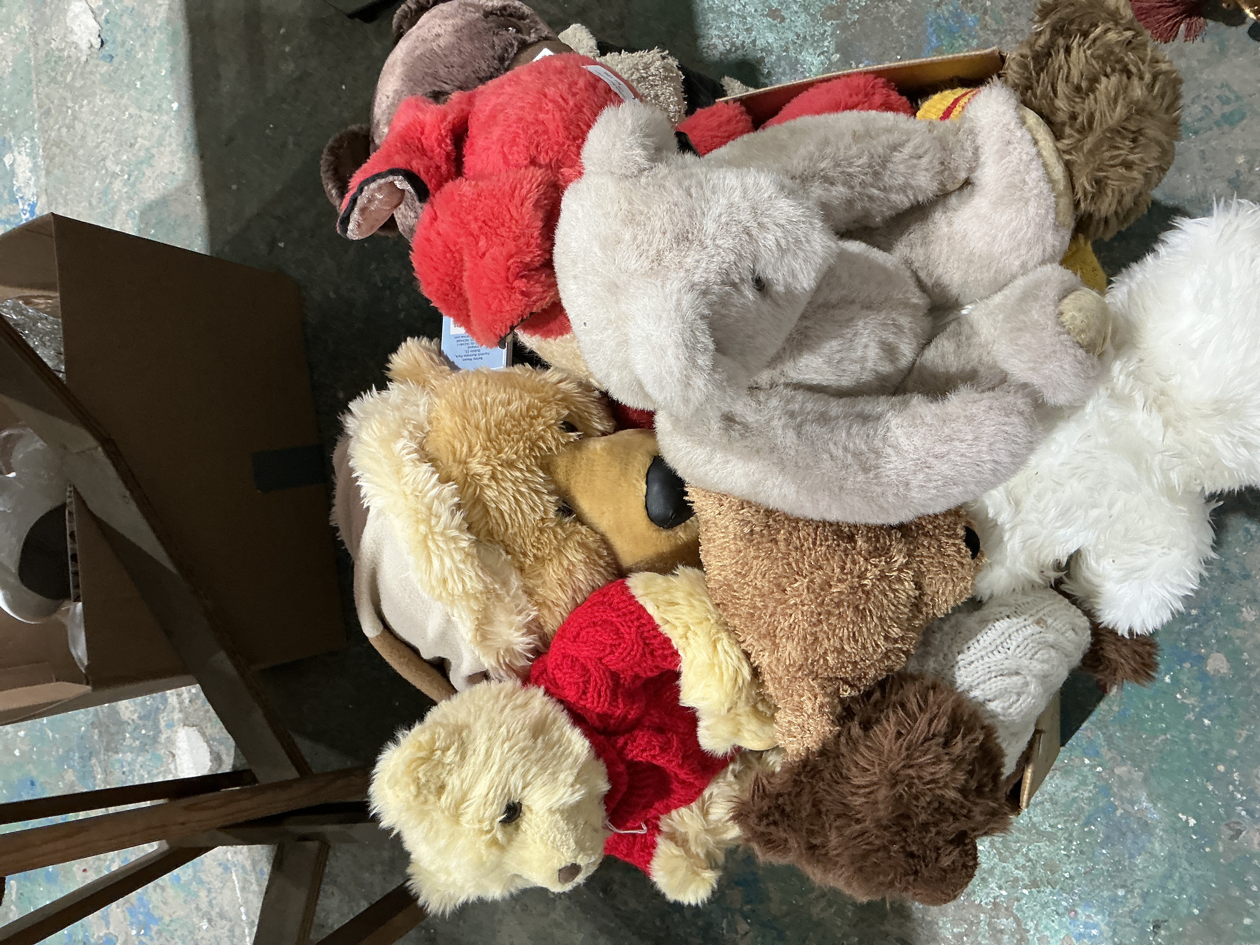 A collection of assorted plush teddy bears and stuffed animals in various sizes and styles. The lot features a variety of plush textiles, ranging from long-pile shaggy fabrics to shorter, dense materials. The color palette includes shades of brown, tan, cream, and white. Some figures are depicted with textile accessories, notably a red knitted sweater. Visible manufacturer branding includes tags for the Disney Store. The items are housed within a cardboard storage box.