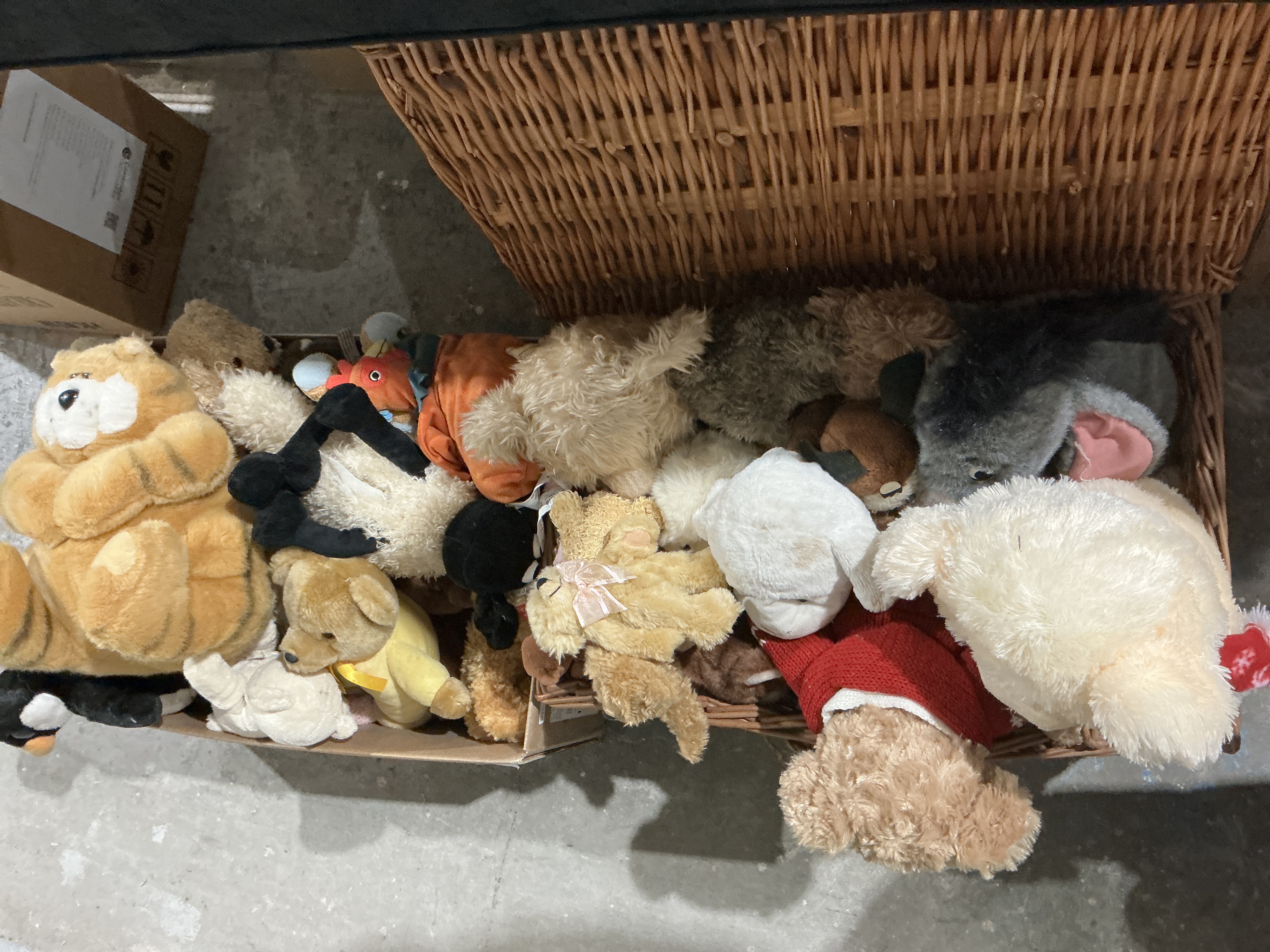 A collection of various plush teddy bears and soft toys of various sizes and designs. The group includes multiple teddy bears in shades of brown, tan, and cream, alongside other animal figures such as a large orange striped cat, a penguin, and a bear wearing a red knit sweater. The items are constructed from various synthetic plush fabrics and shaggy faux fur with polyester stuffing. Many figures feature plastic safety eyes and decorative accents including textile ribbons and knitwear. The lot is presented within a large woven wicker basket and an adjacent cardboard box.