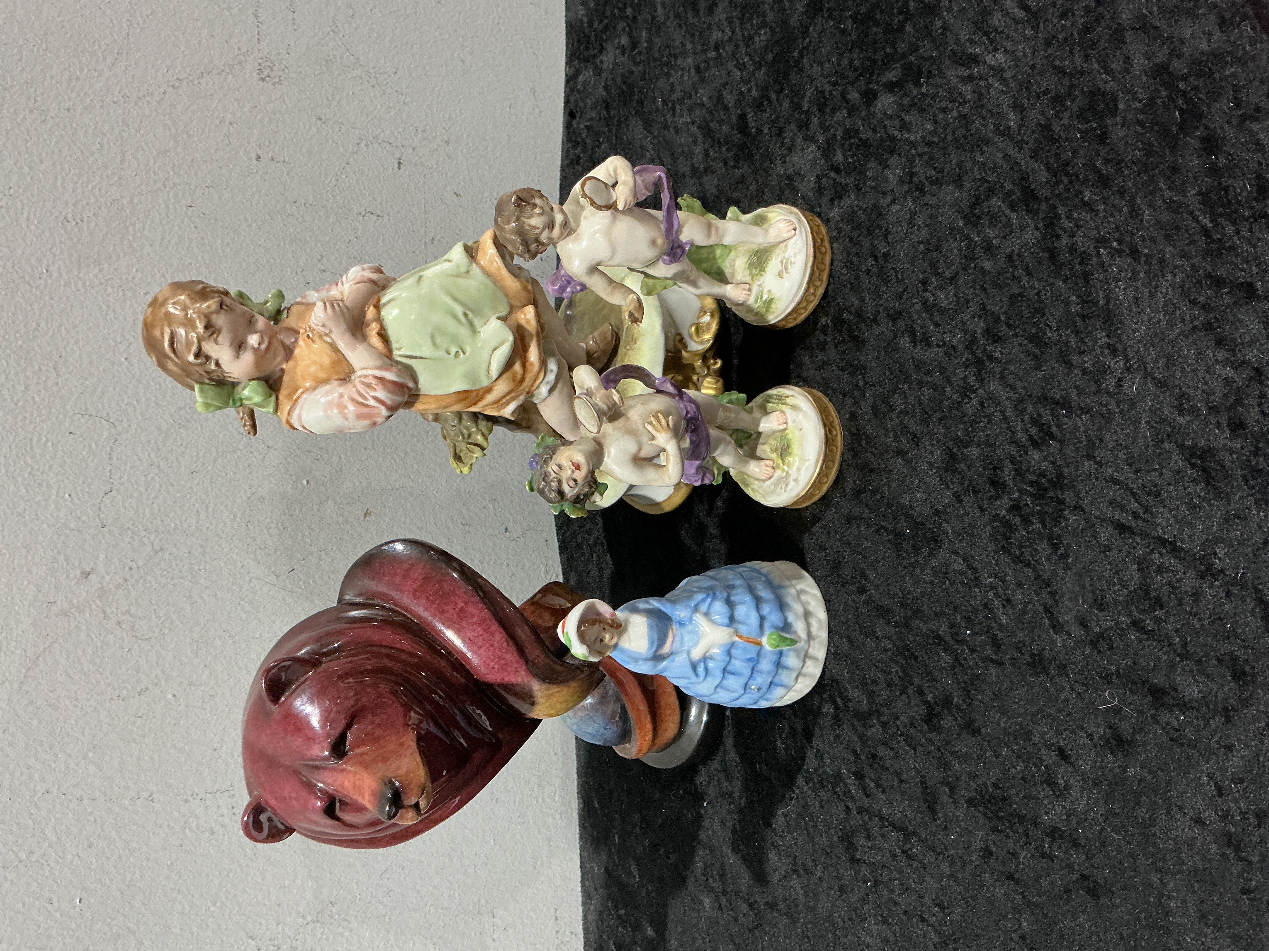 This collection includes several porcelain and ceramic decorative figurines, primarily featuring Meissen porcelain figural groups. The assembly consists of a polychrome porcelain figurine of a young girl in peasant attire, two putti figures on circular bases with gilded accents, a figurine of a woman in a tiered blue dress, and a stylized ceramic bear head with a deep red glaze. The porcelain pieces exhibit traditional modeling and hand-painted polychrome decoration consistent with 19th-century Meissen production. The bear head features a modern, expressive form with a lustrous glaze. No manufacturer markings or inscriptions are visible.