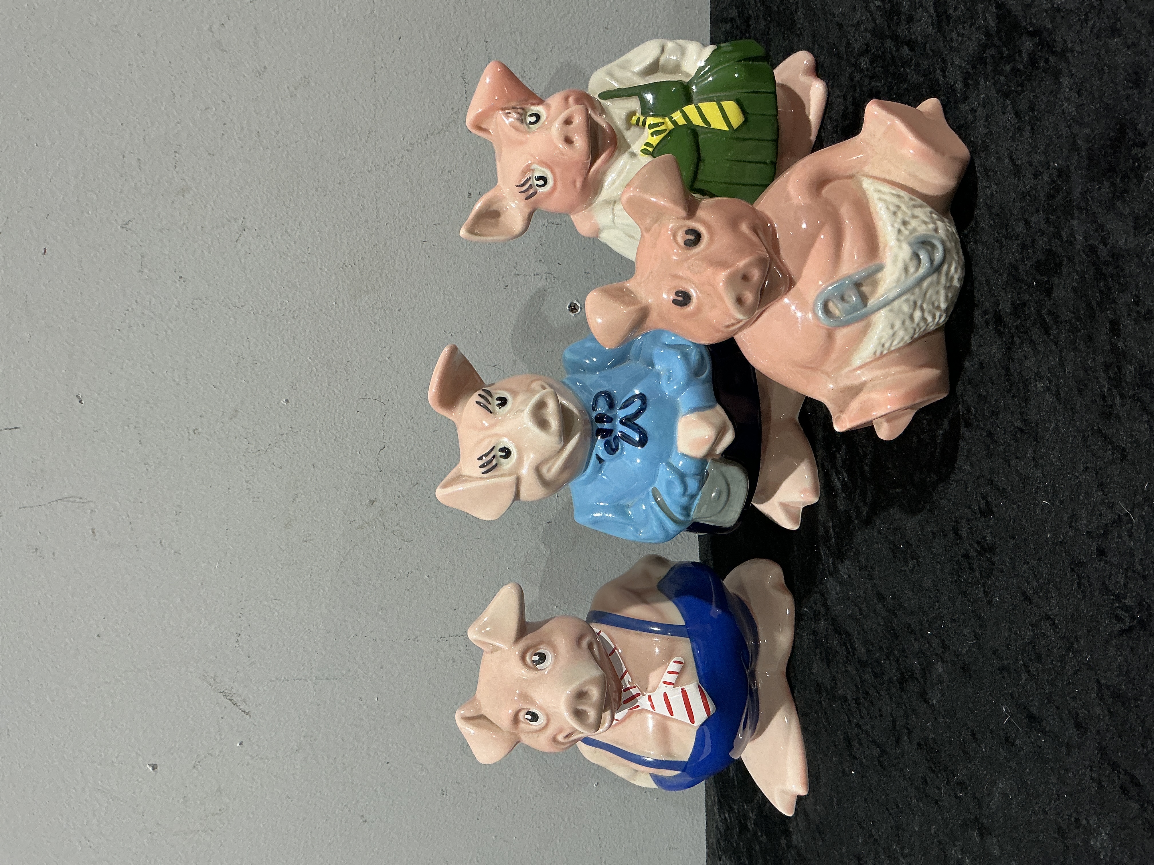 A collection of glazed porcelain money boxes from the NatWest pig family series, manufactured by Wade England. These anthropomorphic figures feature various stylized outfits including a pig in a diaper with a large safety pin, a pig in a blue sweater, a pig in a green skirt with a yellow tie, and a pig in blue overalls with a red-and-white striped tie. Each figure is constructed with a recessed base embossed with the mark WADE ENGLAND. The figures are finished in a polychrome glaze.