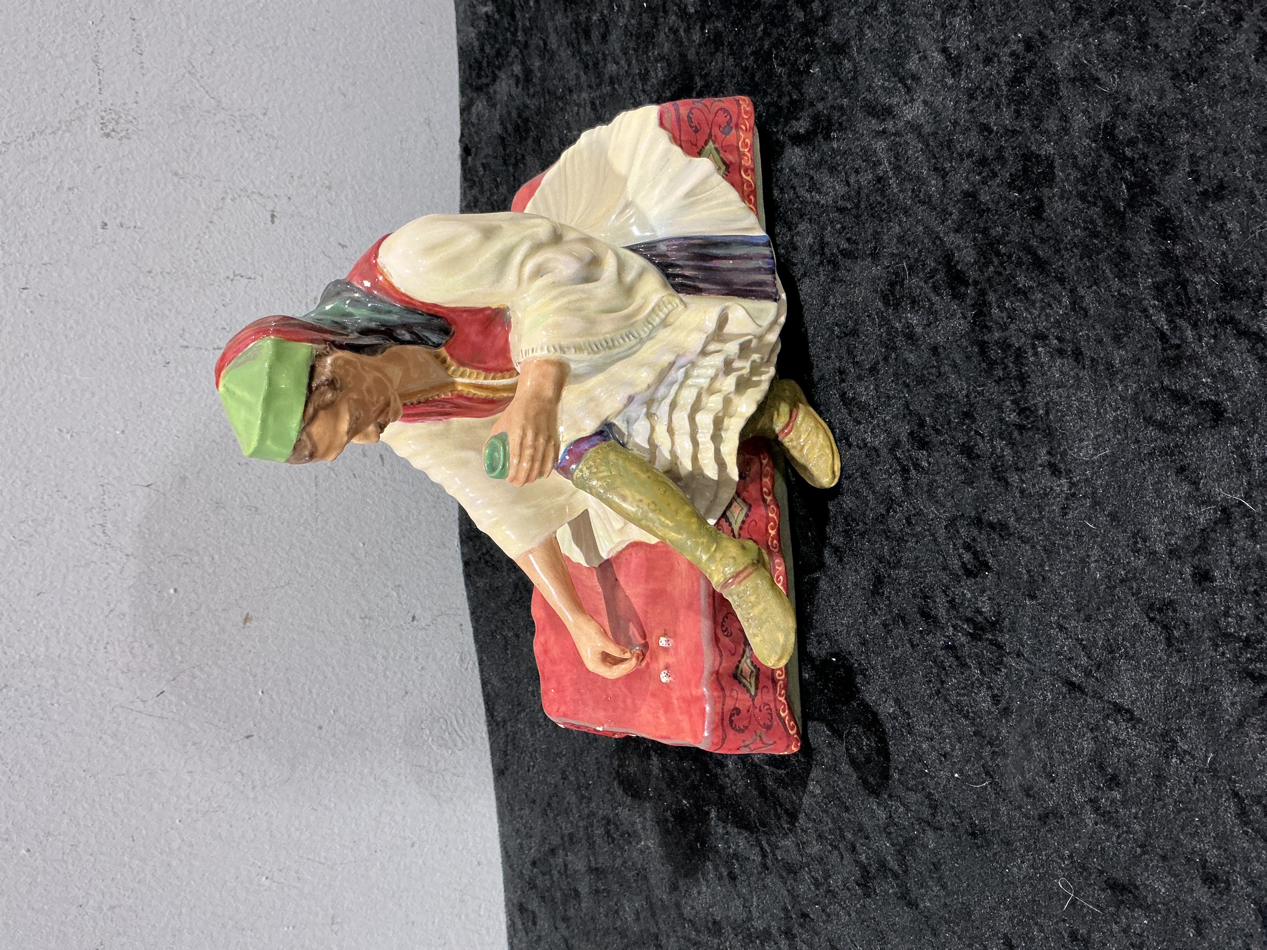 This glazed ceramic figurine, titled Albanian Dice Thrower, is a work by Reg Johnson, a former Royal Doulton artist who produced pieces under the Studio Potter designation. The figure depicts a man in traditional regional attire, featuring a green cap, white tunic, and patterned leggings, kneeling on a red-patterned rectangular rug. The subject is captured in a dynamic pose while tossing two dice onto the surface. The piece is constructed of hollow-cast ceramic with a polychrome glazed finish. The underside of the base is hand-inscribed with the title ALBANIAN DICE THROWER BY THE STUDIO POTTER, a stylized monogram, and the signature FR JOHNSON.